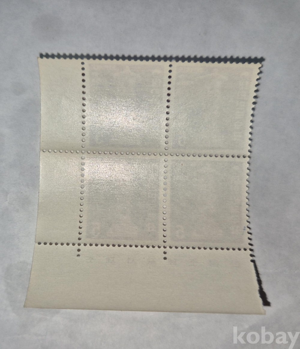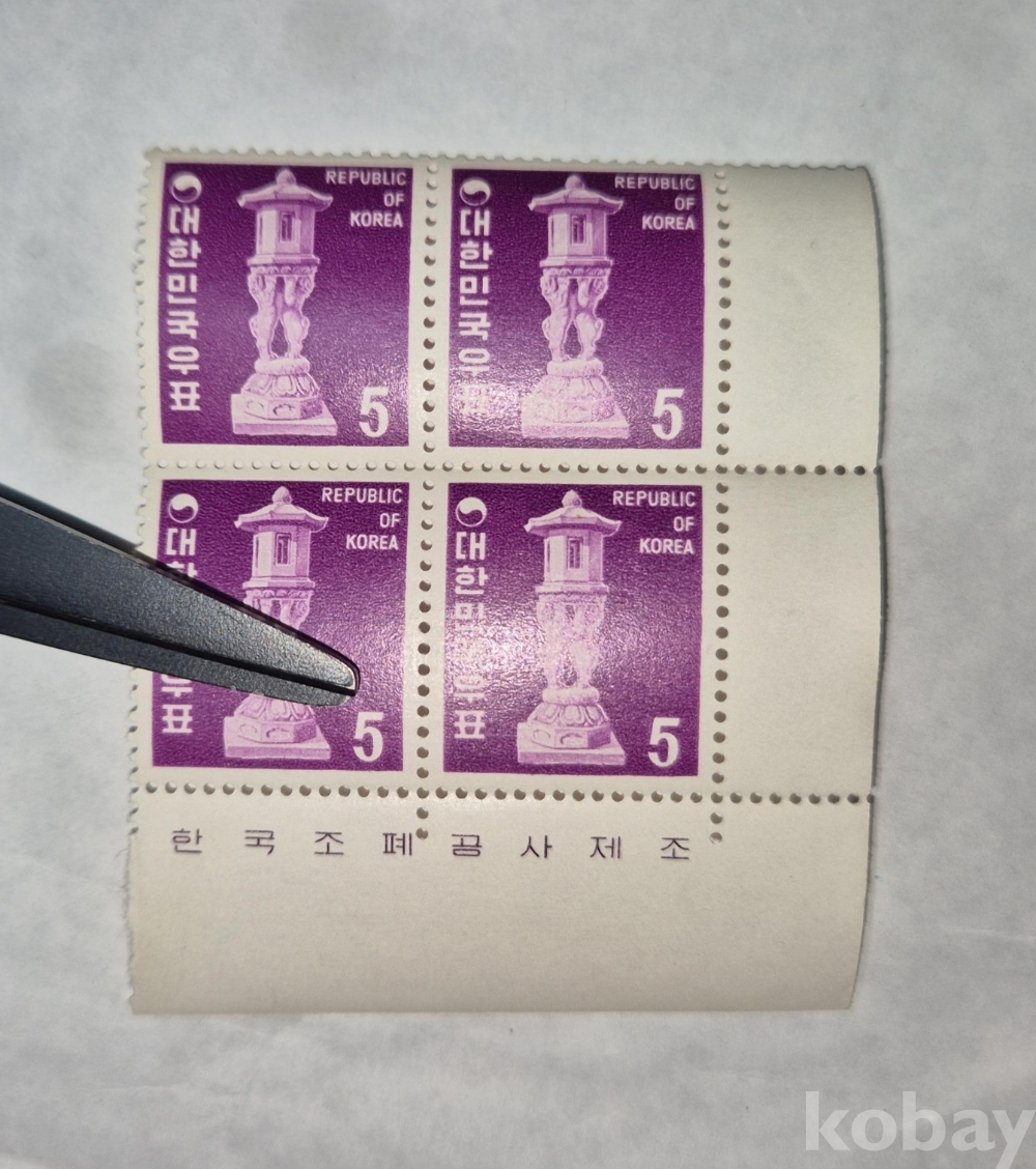 1969년에 발행한 제1차 그라비아 '쌍사자 석등' 보통우표 5원 4매 명판부 블록입니다.