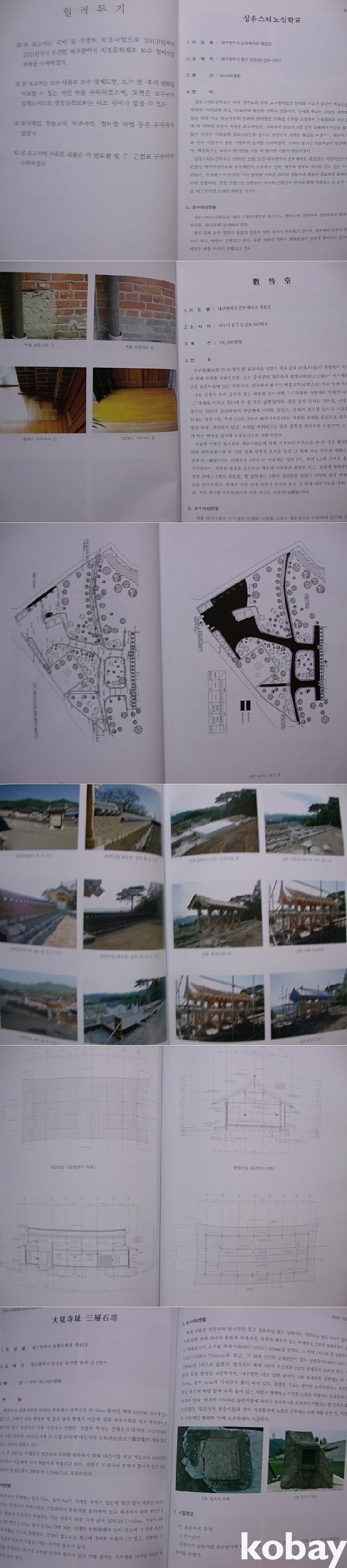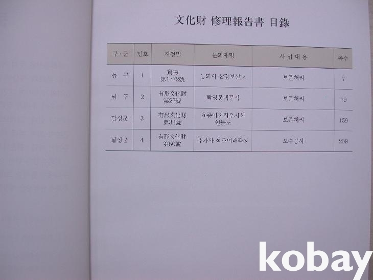 앞에 대구 구별로 16건의 <목록>이 먼저 제시되어 있고, <일러두기>에 이어 바로 본문이 시작된다. 문화재마다 연혁 등 개설에 이어 보수현황을 사진도판과 함께 제시하며 수록하였다.