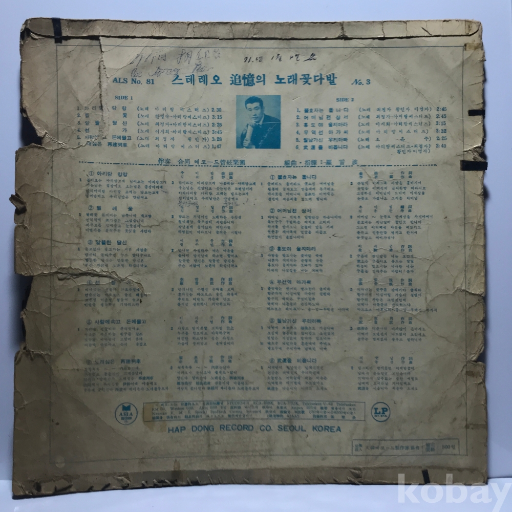 | 자켓상태 | VG : 주름, 접힘, 모서리 찢김 다수 | 음반상태 | VG : 생활 기스 다수, 가벼운 노이즈 존재 | 발매정보 | 알수없음 | 가사지여부 | 무 |