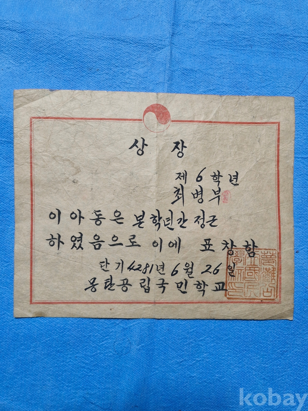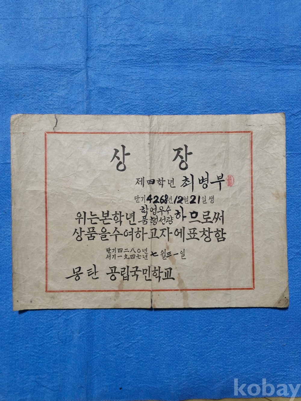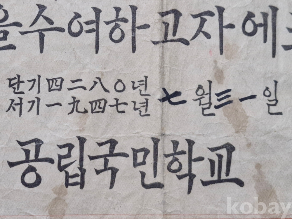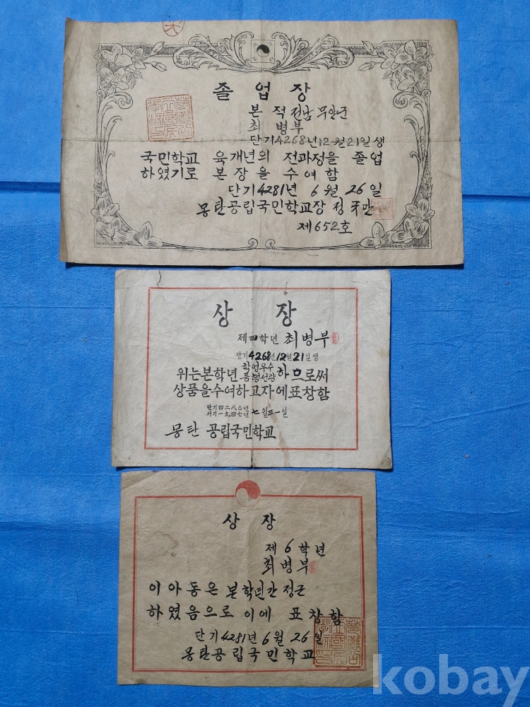 해방이후(1947~48년)의 전남 무안군 몽탄공립 국민학교 어린이의 상장 졸업장등 3점 입니다