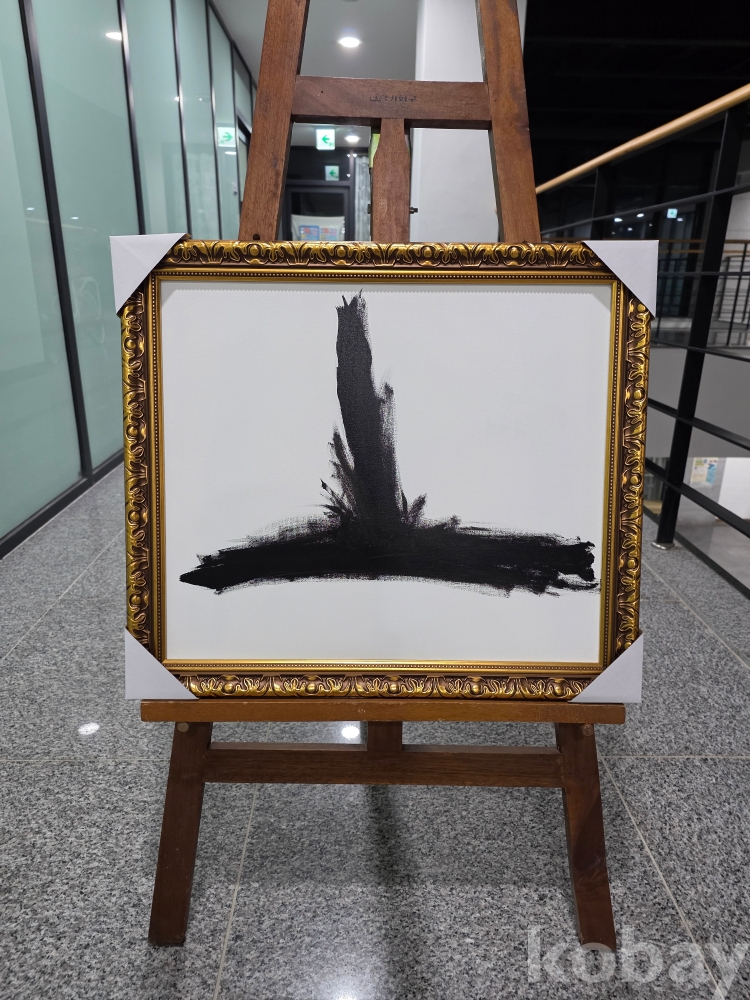 본 작품은 정혁 작가의 작품 ‘우주의 균열’을 바탕으로 조형 요소를 재해석한 오마주 형식의 원화 작업으로, 원작자와는 별개의 독립 저작물이다. 화면 중앙을 기준으로 수직과 수평의 검은 스트로크가 교차하며 여백이 강조된 구성을 이룬다. 잉크와 아크릴의 번짐과 농담 차이가 자연스럽게 남아 있어 단순한 구조 속에서 선의 방향성과 밀도가 또렷하게 드러난다.