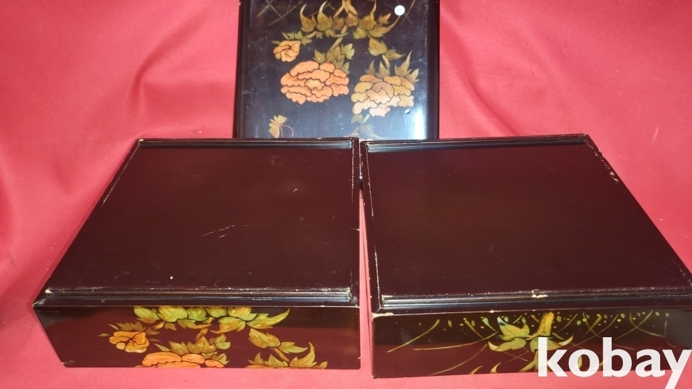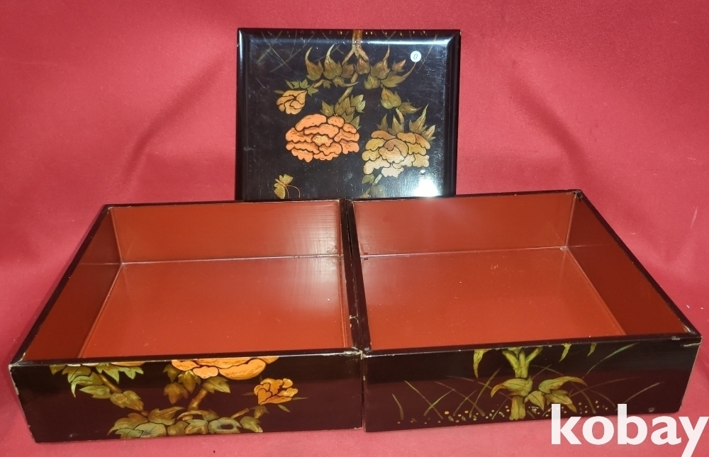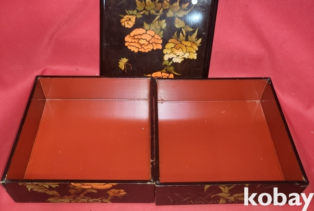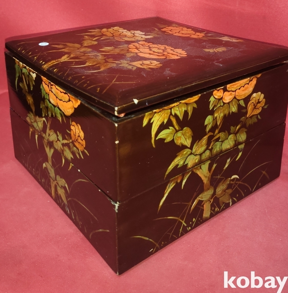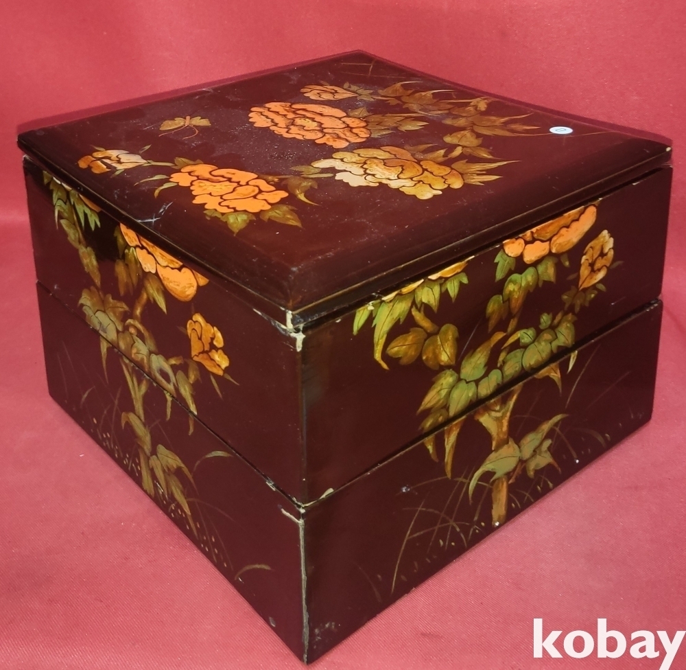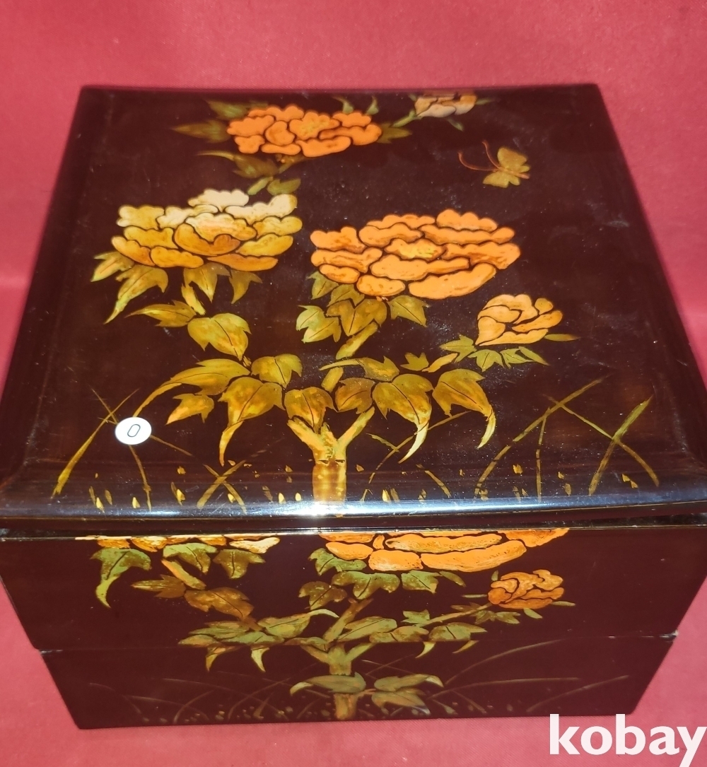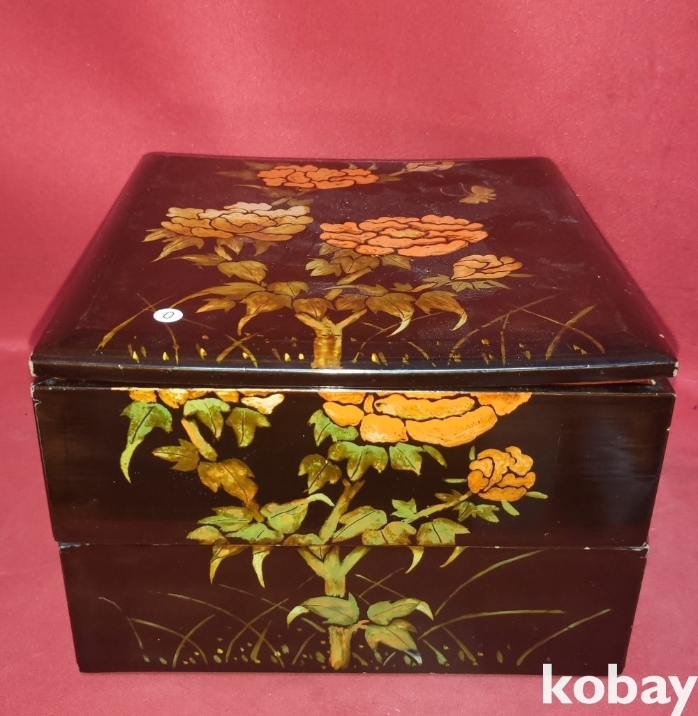 조선황실의 마지막 왕조가 남긴 낙선재(樂善齋) 표기 조선궁중 유물로 나무에 紅.黑 옻칠 마감한 목단 꽃 문양 2단 함입니다,