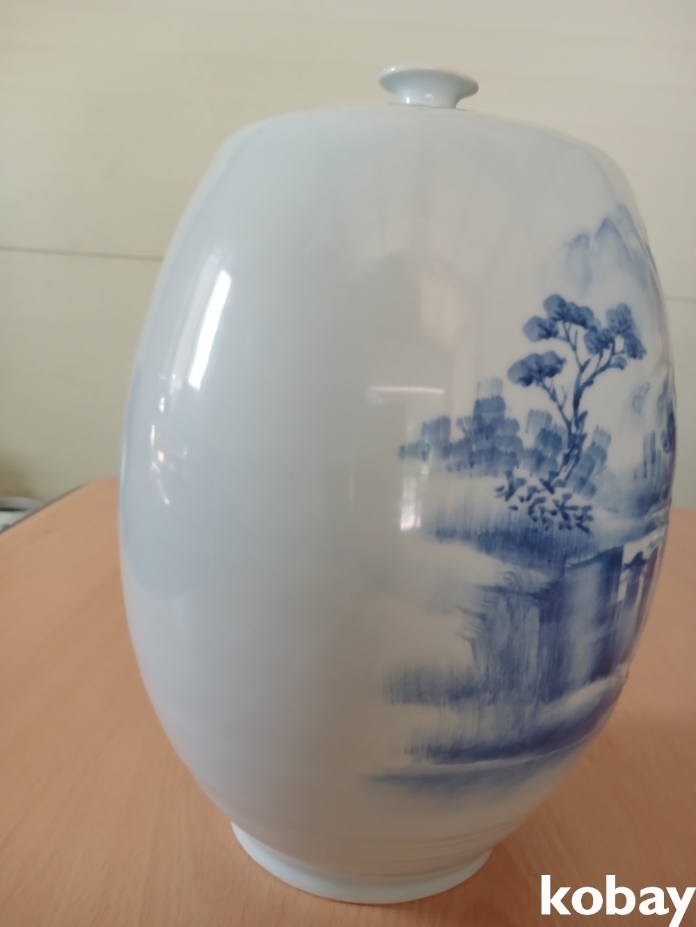 산수 풍경을 아름답게 표현한 입이 작은 도자기 입니다.