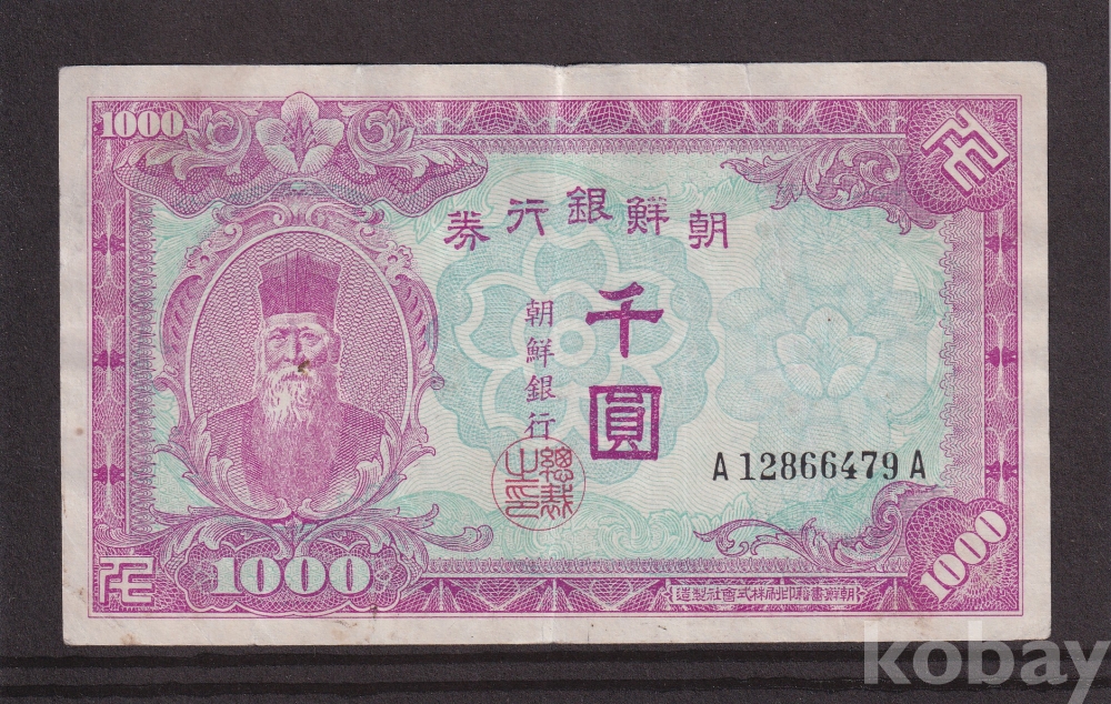- 조선은행 1950년 미발행 북괴 천원 AA기호 사용제 지폐