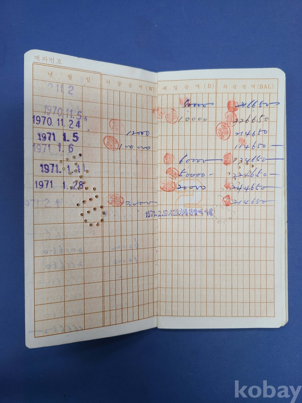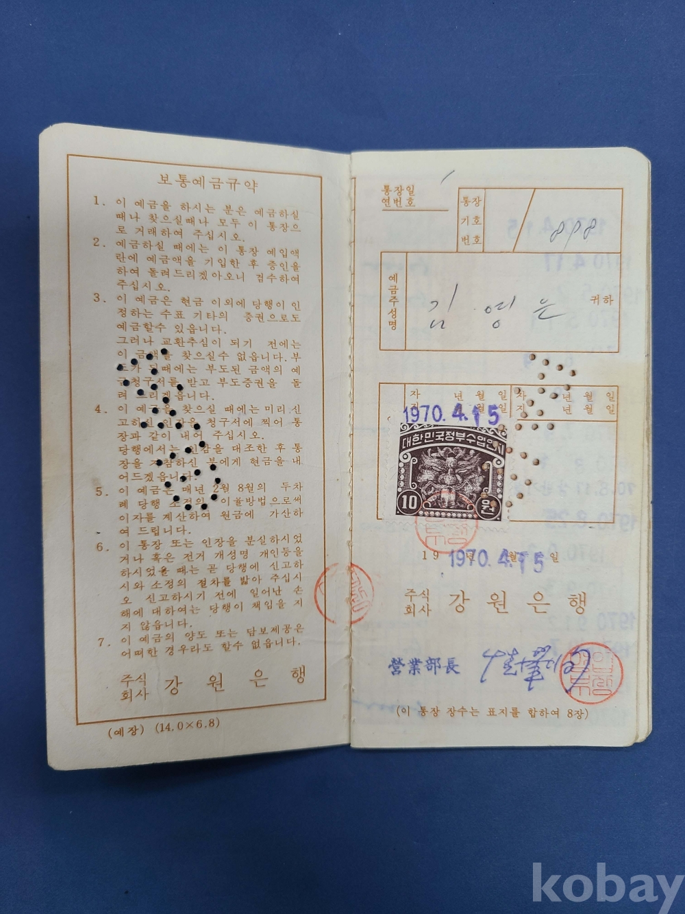 보통예금통장*수입인지 첩부,강원은행,1970.4.15