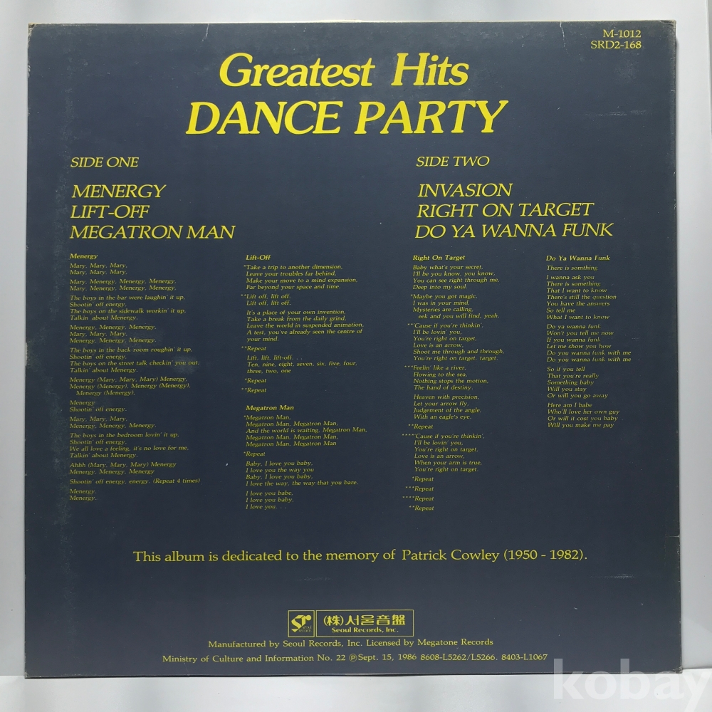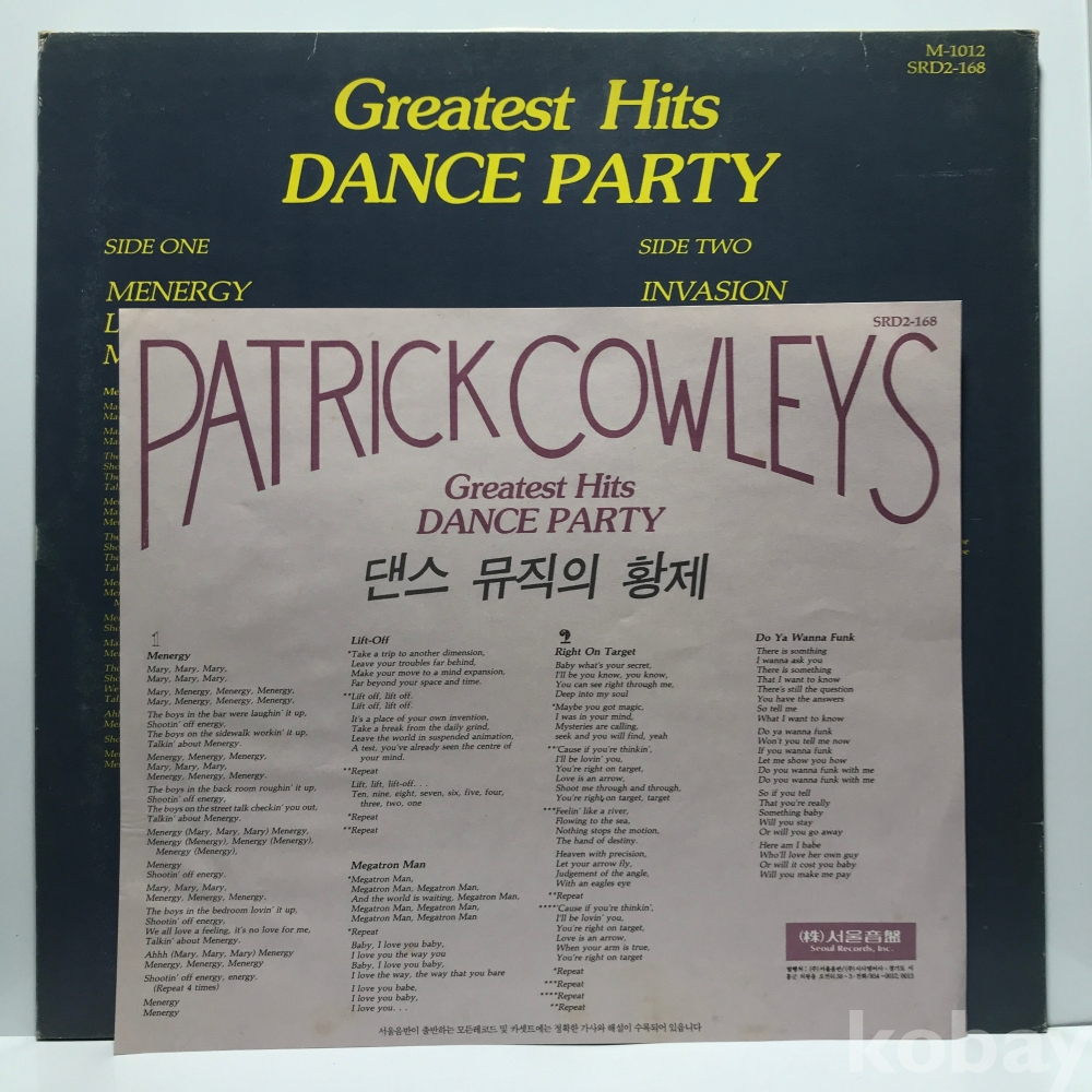 LP 10,800-49 Greatest Hits DANCE PARTY PATRICK COWLEY's 86 서울 자켓 EX+ 알판 EX+