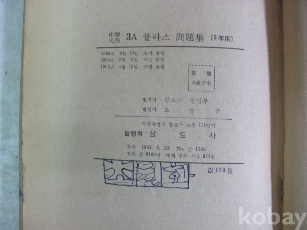 (중학3) 영어 쓰리에이클라스(3A class) 문제집 (1965년, 서울대 문리과대학 교수 전제옥 감수, 삼도사)