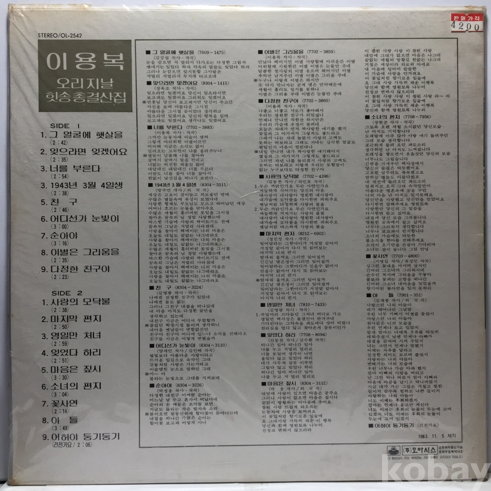 미개봉 LP 82,400-75 이용복 오리지날 힛송총결산집 - 그 얼굴에 햇살을_미개봉 자켓 SS 알판 SS 83 년 국내반