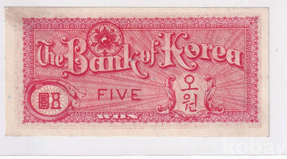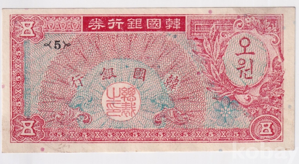 - 한국은행 1953년 거북선 미제 오환(원) 판번호 5번 준미 지폐