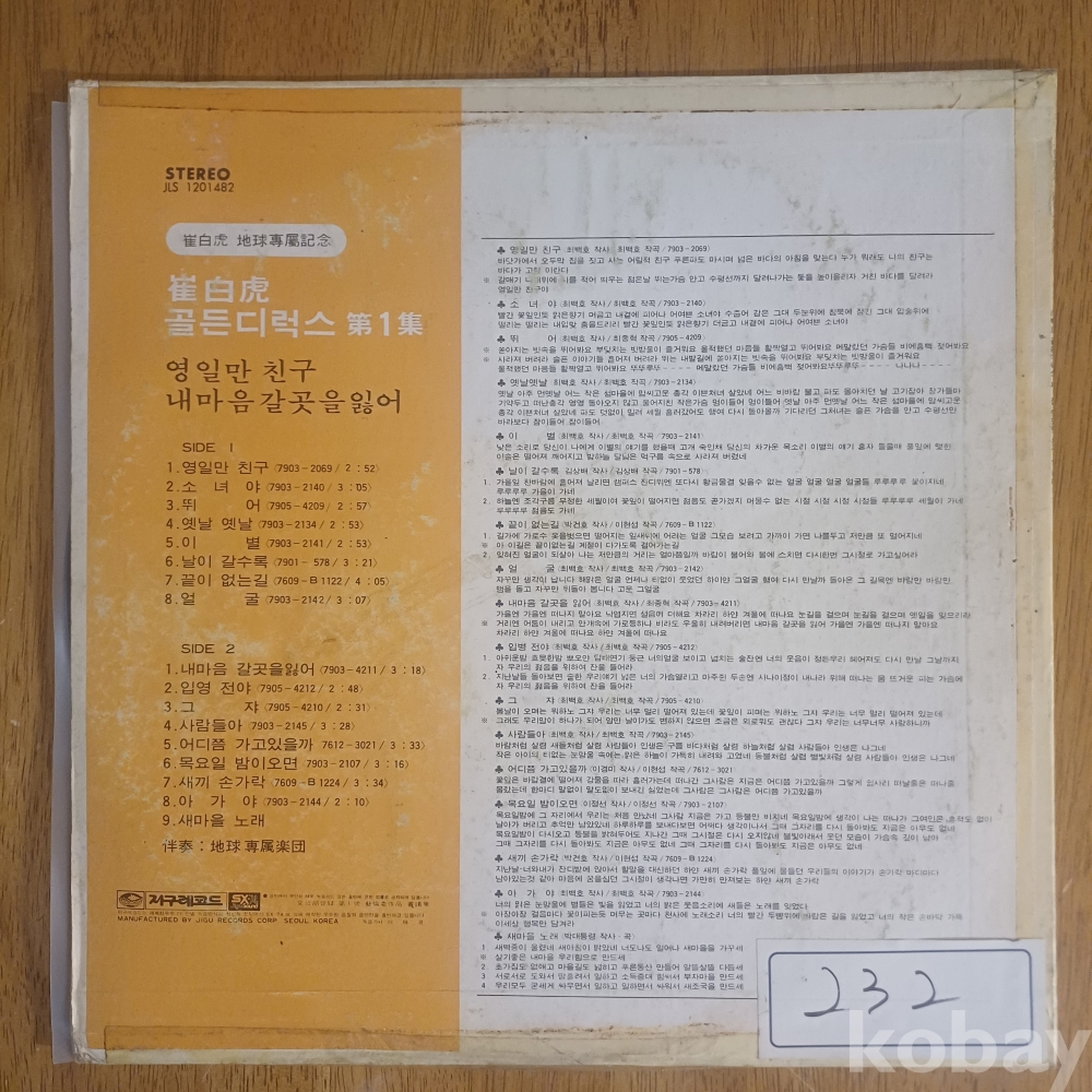 | 자켓상태 | EX : 약간의 마모, 모서리 찢김 존재 | 음반상태 | EX : 재생에 영향 없는 가벼운 기스 존재 | 발매정보 | 초반 | 가사지여부 | 무 |