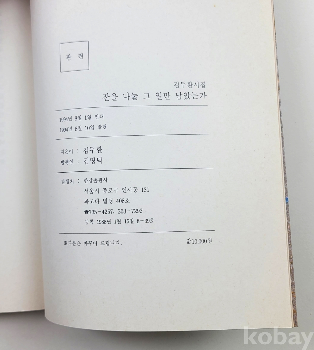 물 품 명 | 김두환 / 잔을 나눌 그 일만 남았는가 / 문학공간시인선(27) / 1994년 초판 / 한강출판사 |
