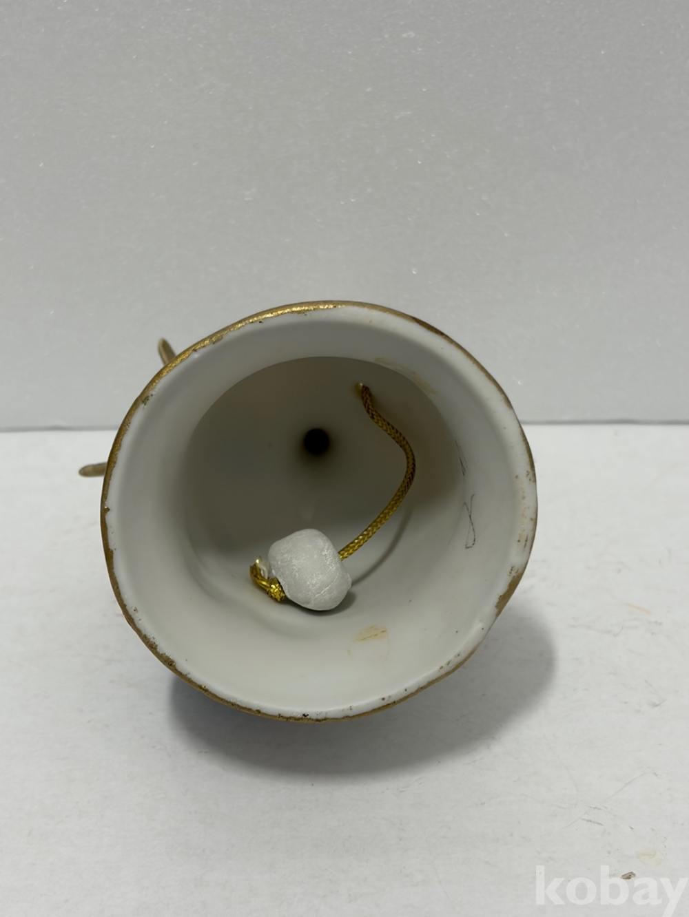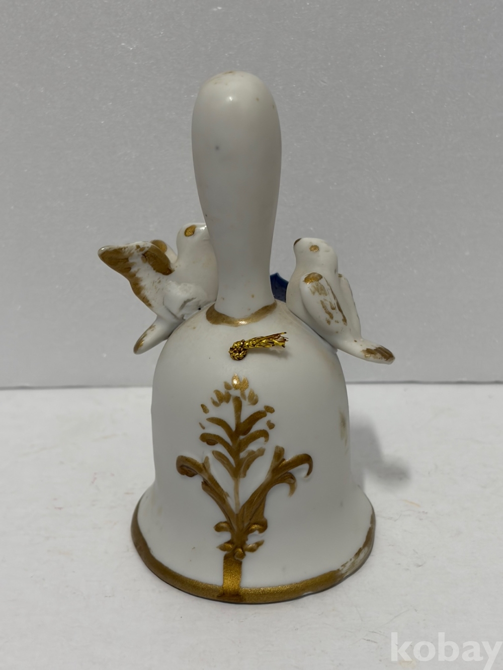 비둘기와 꽃 장식이 있는 도자기 종입니다.