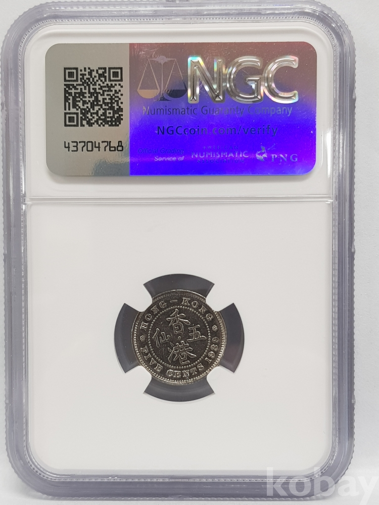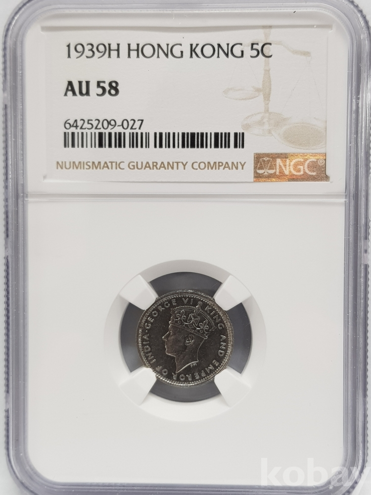 - 1939년 홍콩 조지 6세 5센트 NGC AU 58 그레이딩 주화