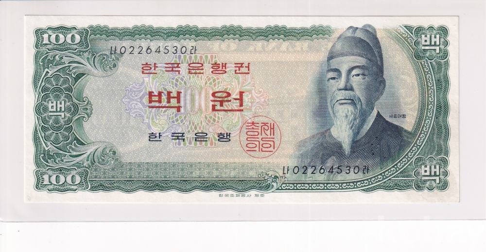 - 한국은행 1965년 세종 백원 나라 02264530 미사용 (-) 지폐