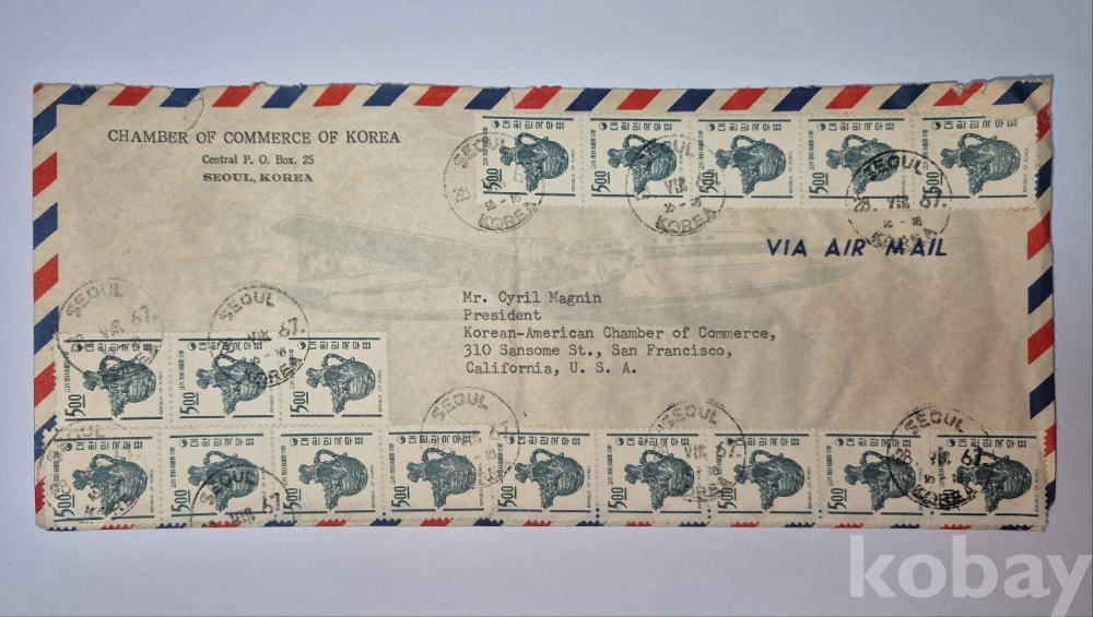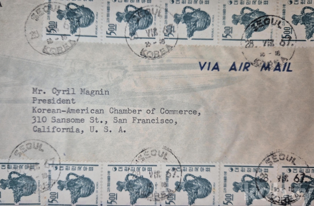 대한민국 상공회의소에서 미국 샌프란시스코 한인 상공회의소 회장 'Cyril Magnin' 에게 보내진 실체입니다.