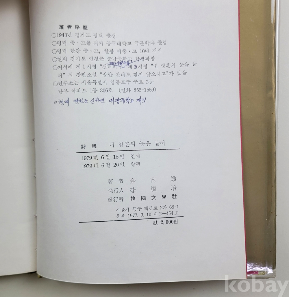 물 품 명 | 김남웅 : 제2시집 / 내 영혼의 눈을 들어 / 1979년 초판 / 한국문학사 |