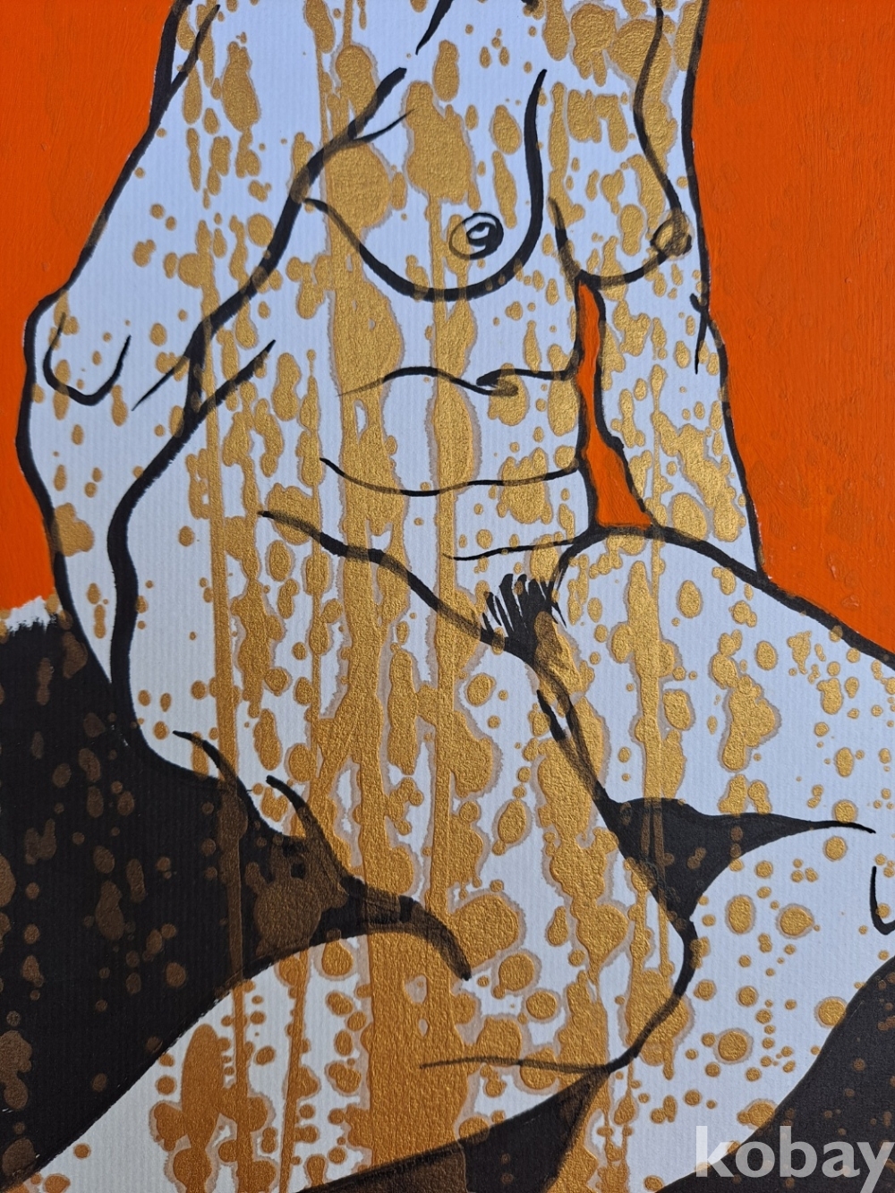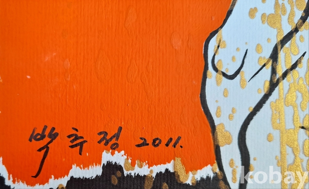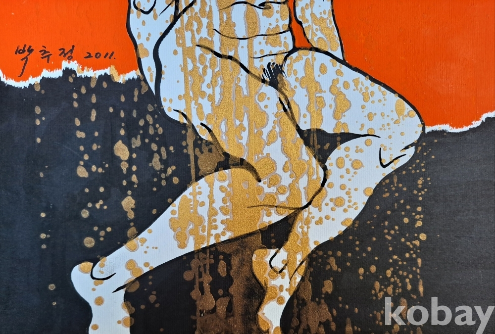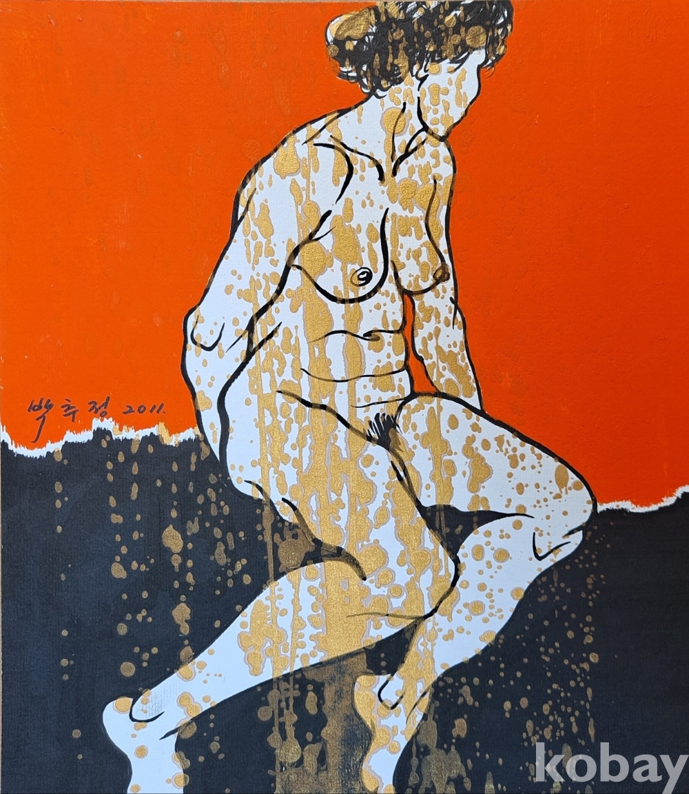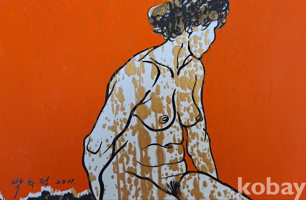본 작품은 박종구 작가가 2011년에 제작한 5호 누드 유화로, 강렬한 오렌지 색면과 단단한 선묘, 그리고 두터운 마티에르가 돋보이는 작품입니다. 화면 전체에 드리워진 금빛 물감의 흩뿌림 효과는 작품에 독특한 질감과 생동감을 부여하며, 중심 인물의 형태를 보다 입체적으로 강조하고 있습니다.