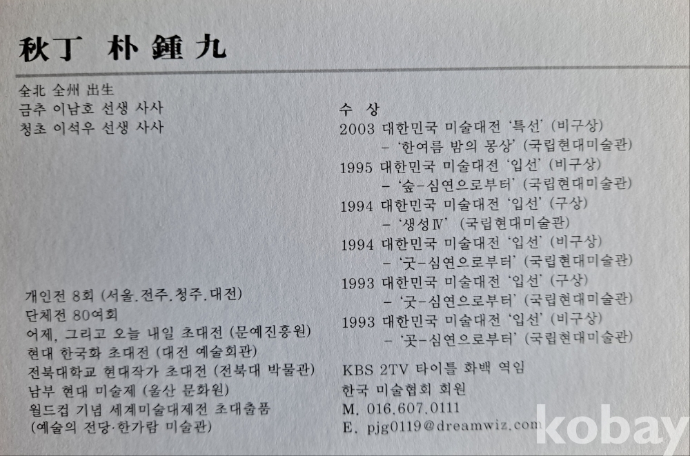 한국수채화공모전 특선·입선 4회, 경상남도미술대전 특선·입선 4회, 개천미술대전 입선 2회, 가야미술대전 입선 등 다수 공모전에서 실력을 인정받았으며, 개인전 12회, 초대전 및 단체전 70여 회를 통해 왕성한 활동을 이어왔습니다.