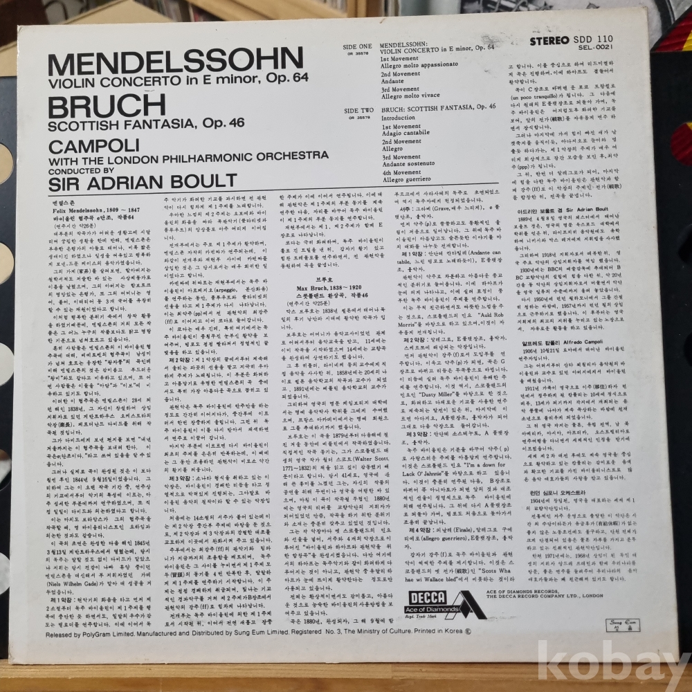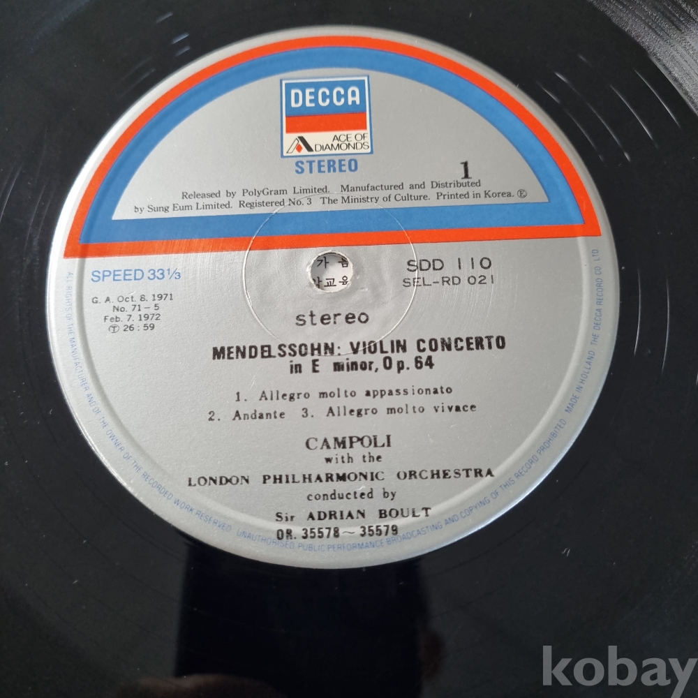 MENDELSSOHN 멘델스존 바이올린 협주곡 성음 DECCA 1972년
