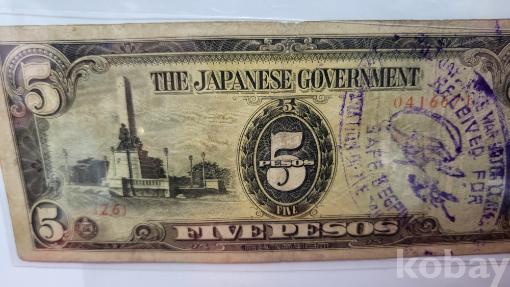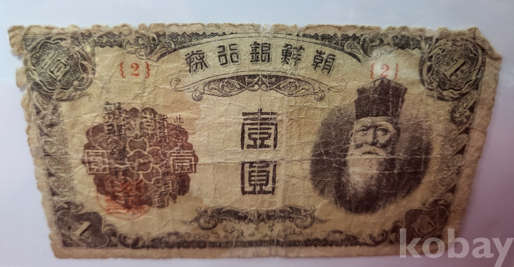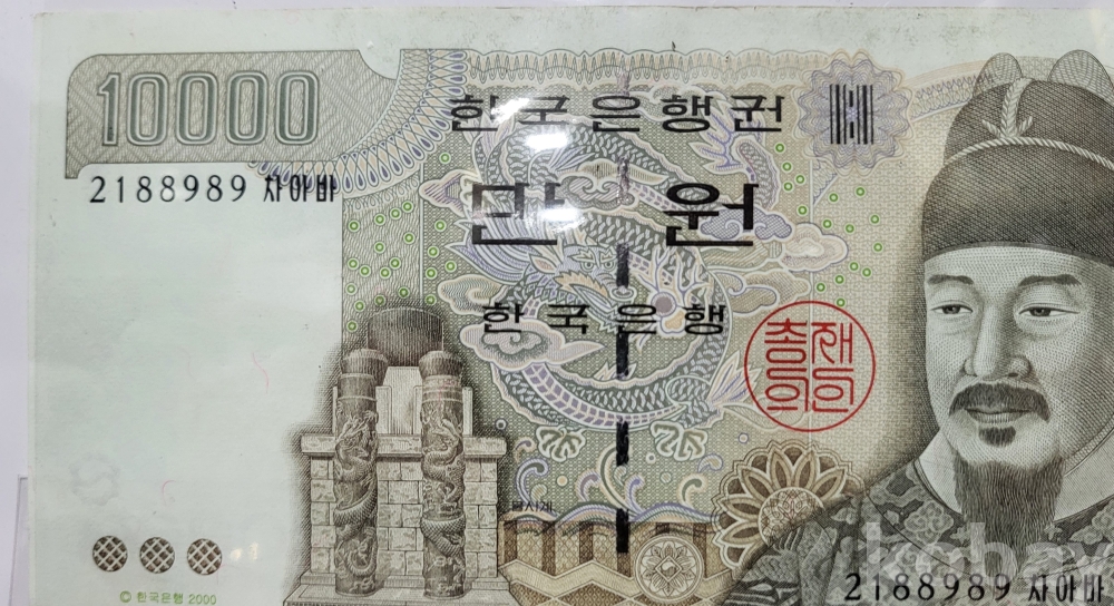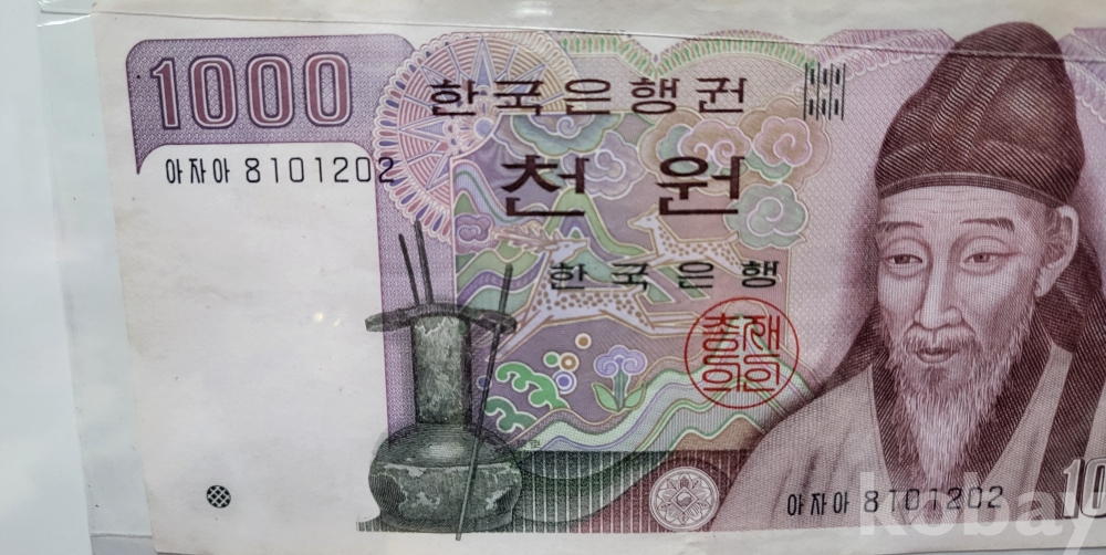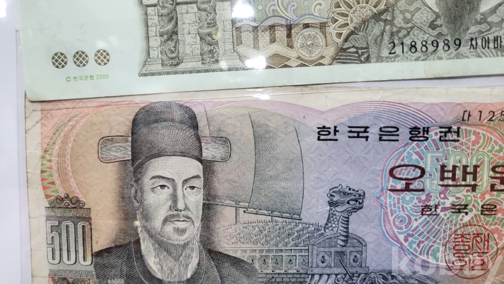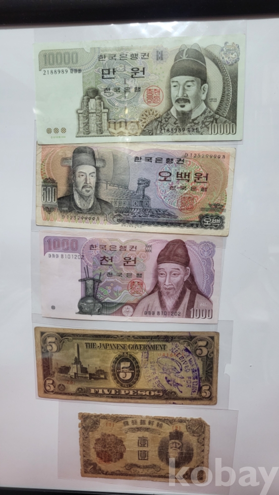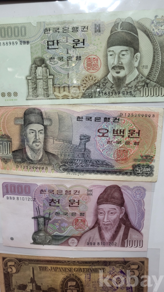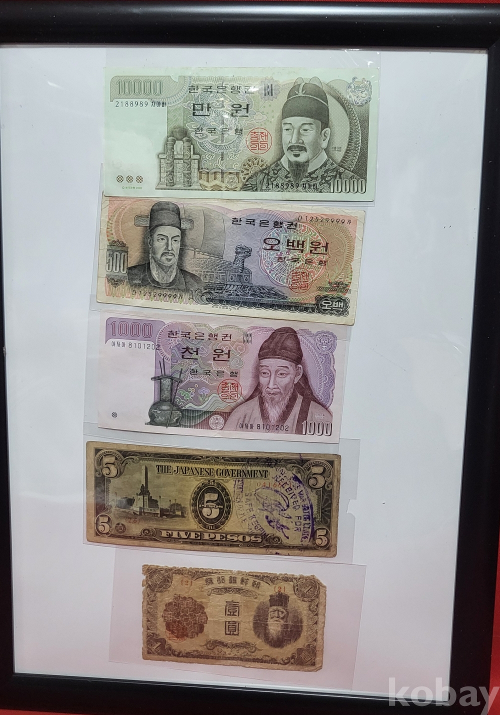 한국 지폐 4장과 일본지폐1장이 들어있는 액자입니다,