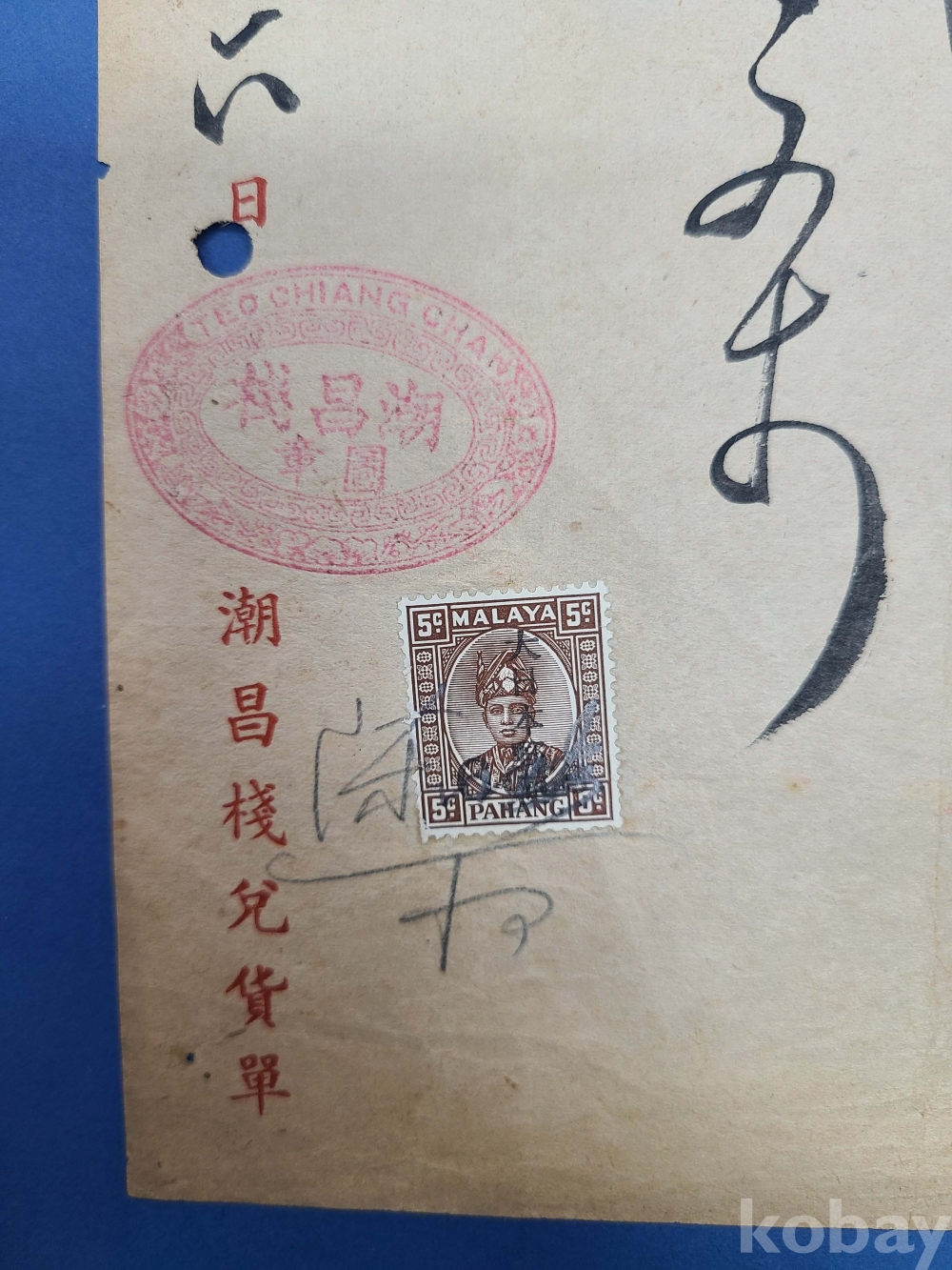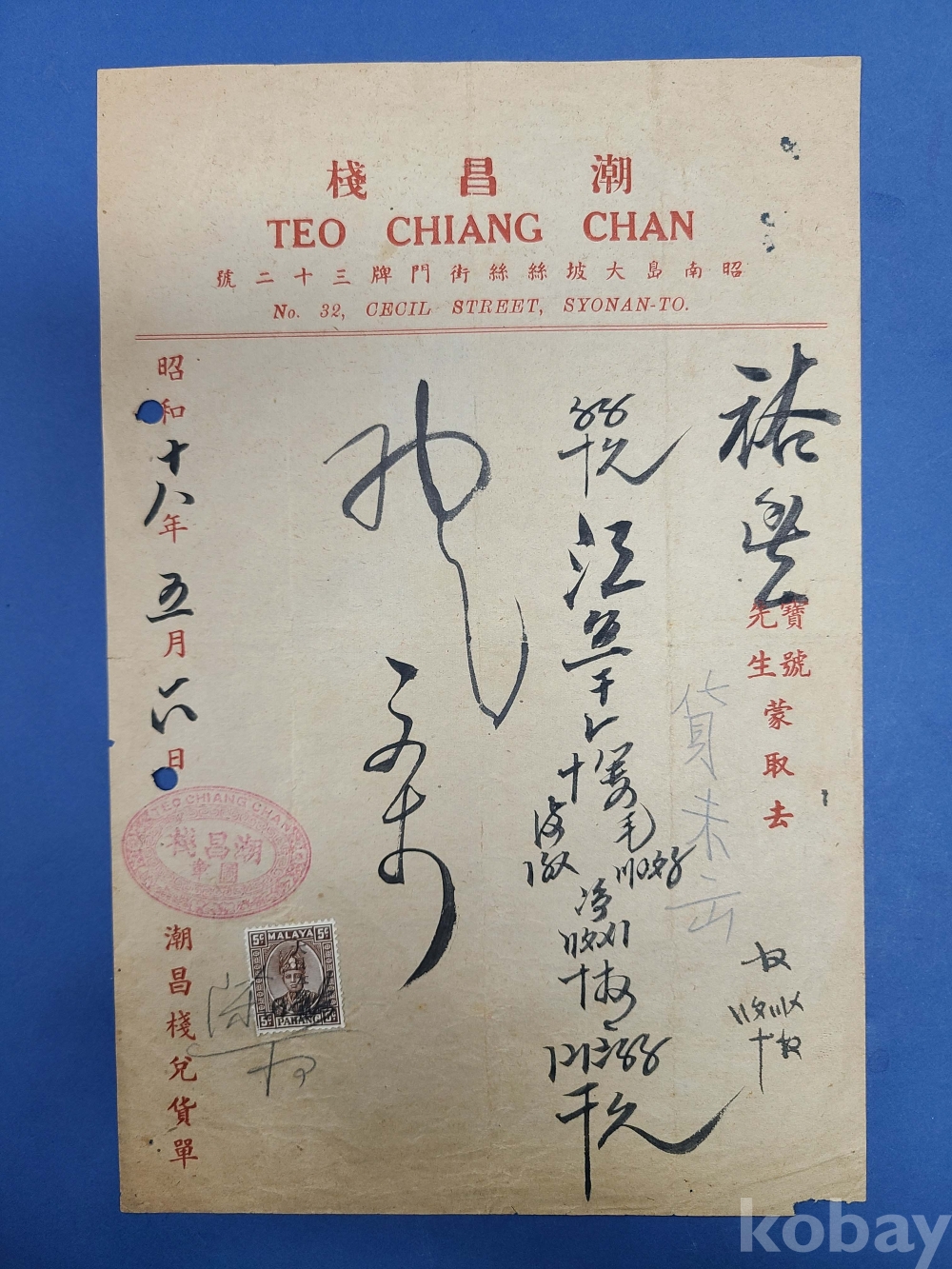 1943년 태평양전쟁시 일본점령지 말라야 5c우표 첨부 TEO CHIANG CHAN 문서