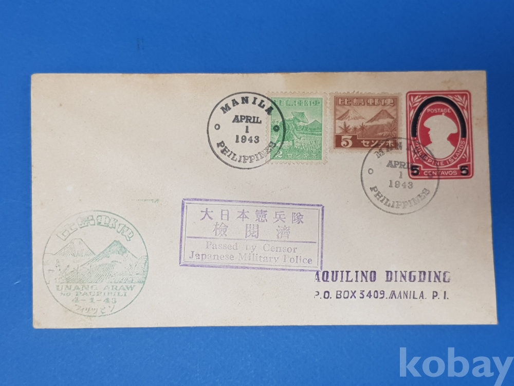 **** 필리핀 마닐라, 일본군 검열 소인분/1943.4.1/우표3매 첩부
