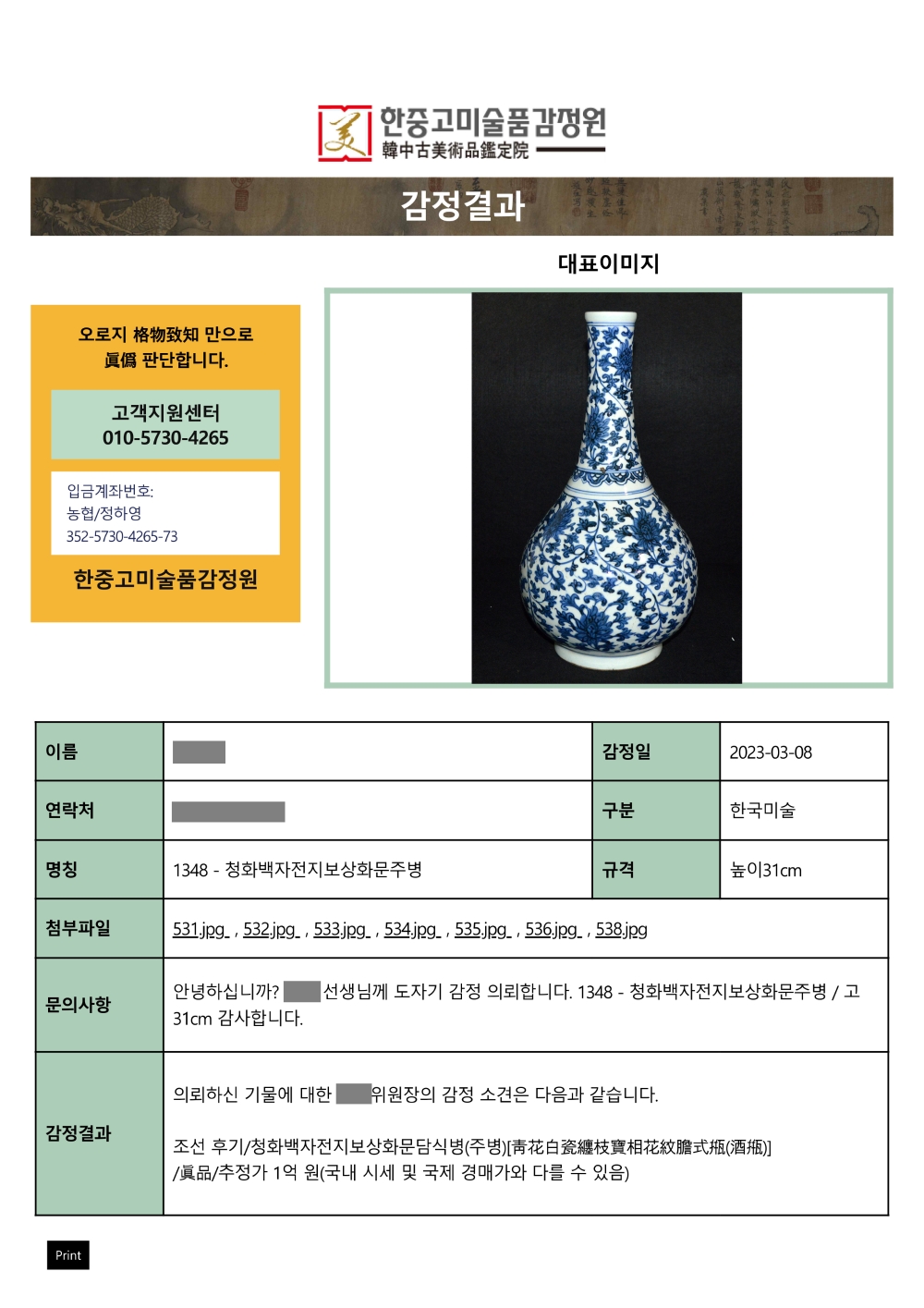 특히 기물을 받고 나서, 누구에게 보였더니 가짜라 하더라 하시며 반품하는 분들이 있는데, 이런 분들은 절대 입찰하지 마십시요.