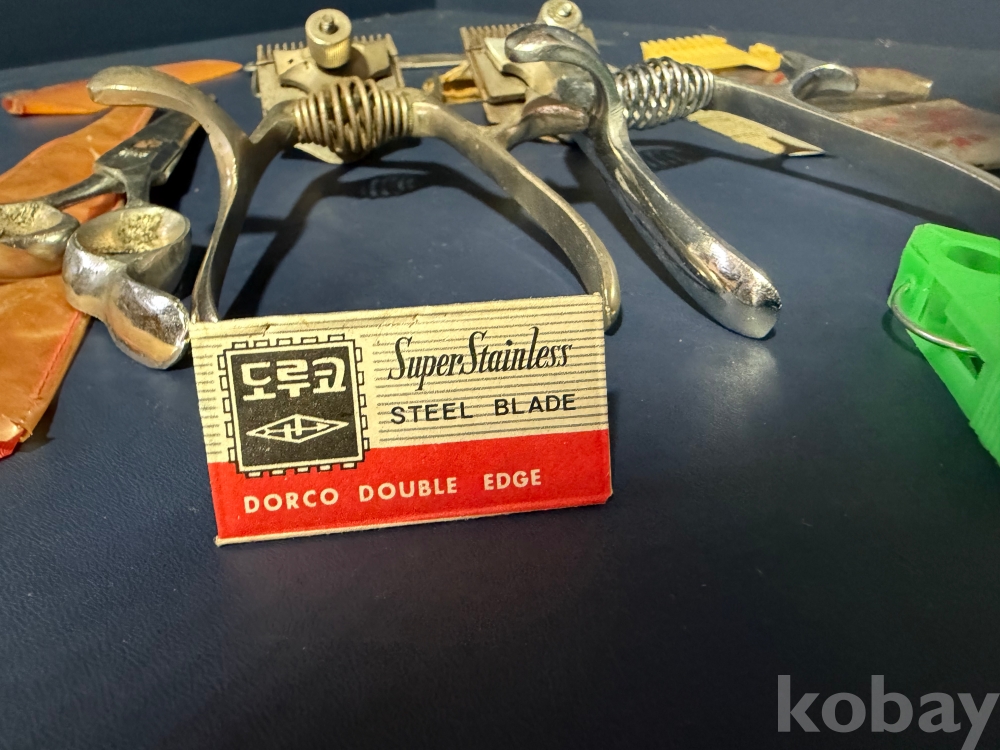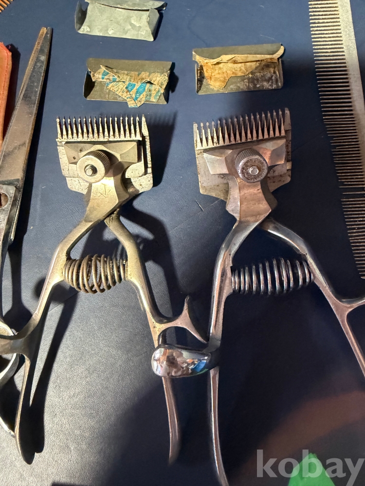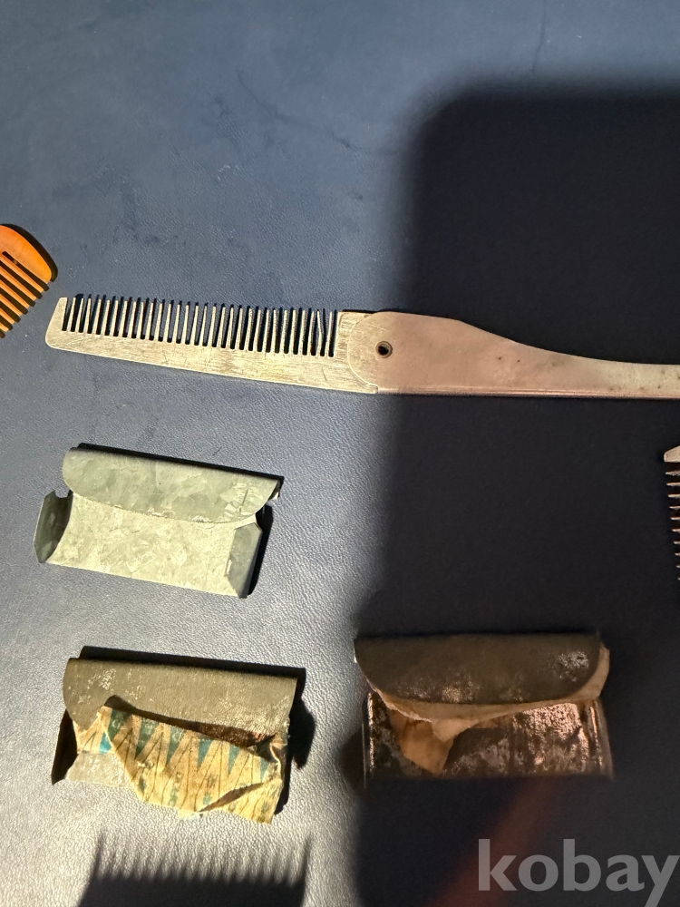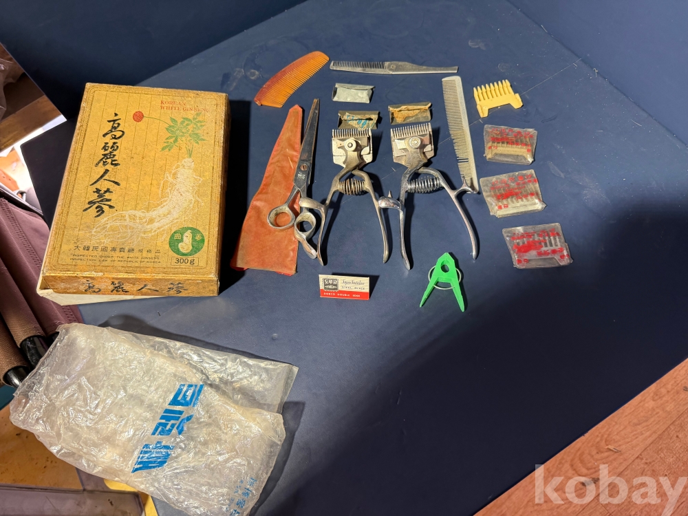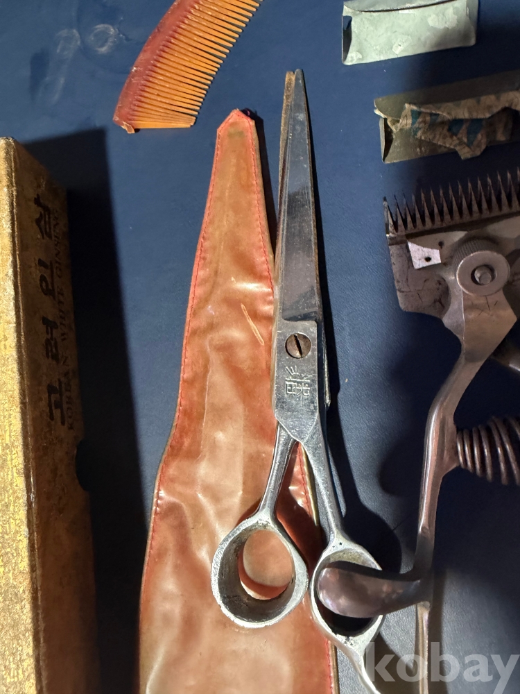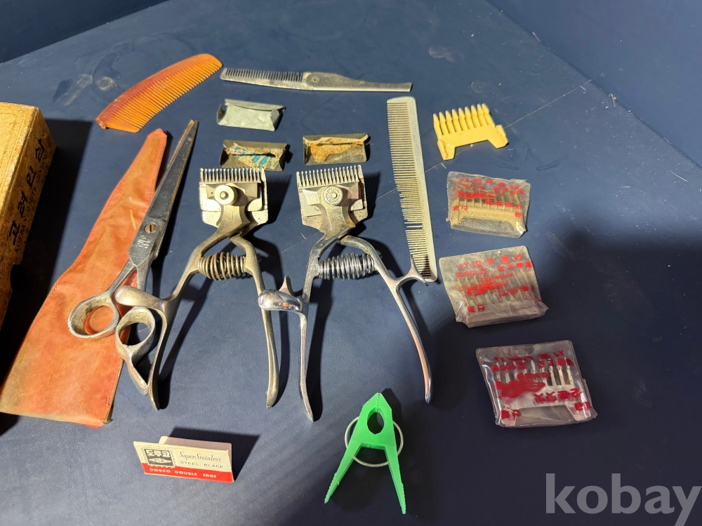 오래된 이발소에서 나온 이발소 용품 입니다.수집 할 당시 고려 인삼 종이 박스에 들어있던 그대로 입니다.상태 좋고 작동 잘되고 날 살아있는 바리깡 2개와 바리깡 덧빗 4개,머리빗 3개,이발 가위 1개,도로코 면도날과 빨래집게 각 1개,고려인감 종이박스 1개의 구성 입니다.보다 자세한건 사진을 참고해주시고 즐거운 경매 되세요.