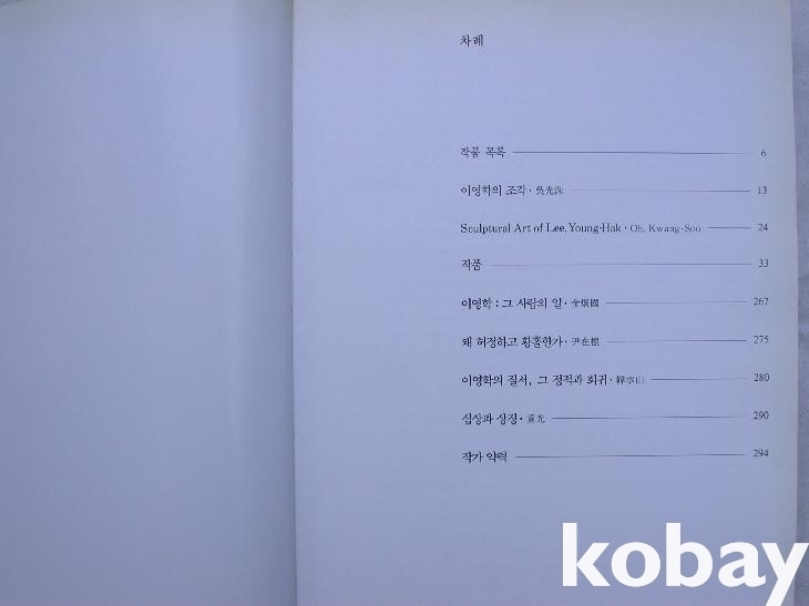 차례에 이어 먼저 235점의 작품목록이 나오고 이어서 오광수의 <이영학의 조각 - 소박함과 함축성, 또는 감동적인 생명감>이라는 해설논고가 있고 영어로도 번역돼 실렸다. 뒤에 김형국의 <이영학: 그 사람의 일>, 윤재근의 <왜 허정하고 황홀한가>, 한수산의 <이영학의 질서, 그 정적과 회귀>, 중광의 <심상과 상징>이라는 글이 실렸고 작가약력이 소개되어 있다.