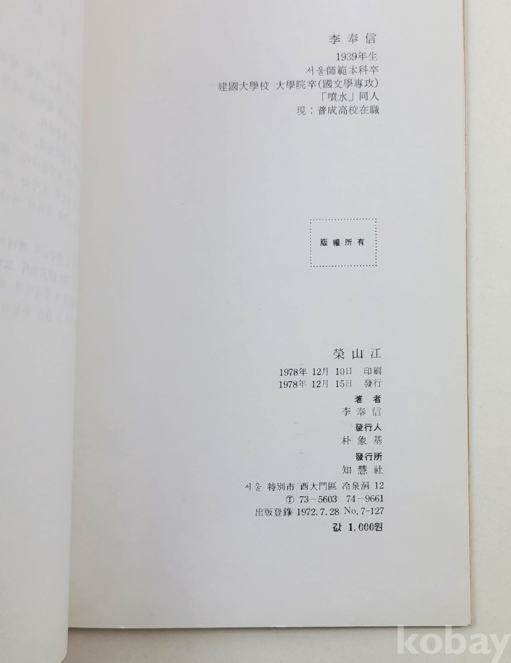 물 품 명 | 이봉신 / 영산강 / 1978년 초판 / 지혜사 |
