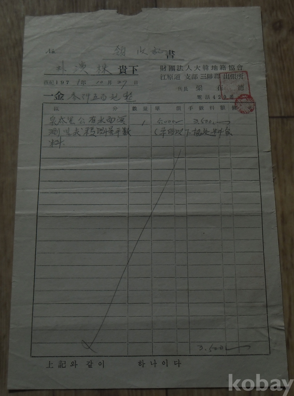 1971년 대한지적협회 삼척군출장소 발행 영수증