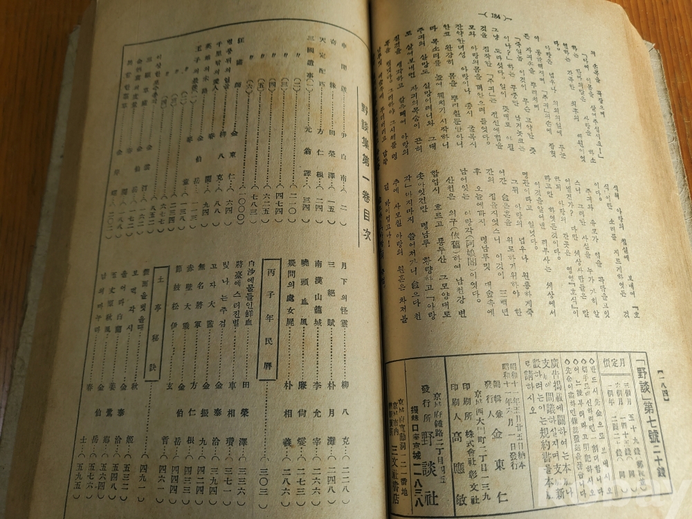 2. 구체적 내용과 구성 : 야담(野談)은 일제시대 경성에서 소설가 춘사 김동인이 1935년 11월에 창간한 야담 전문 월간지로, 이후 1937년 5월에는 임경일한테 발행권이 인수되어 넘어갔으며, 1945년 2월 통권 110호까지 발간함. 이 책에서는 일제시대의 소설, 만화, 야담, 역사, 각종 광고, 풍부한 삽화 등을 확인할 수 있음.
