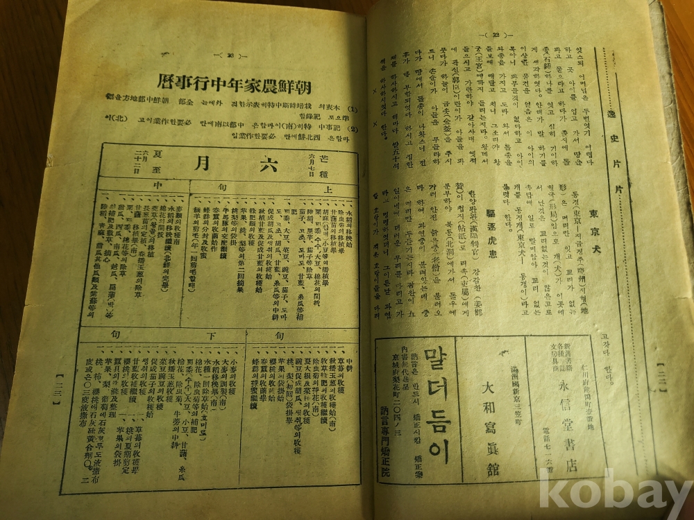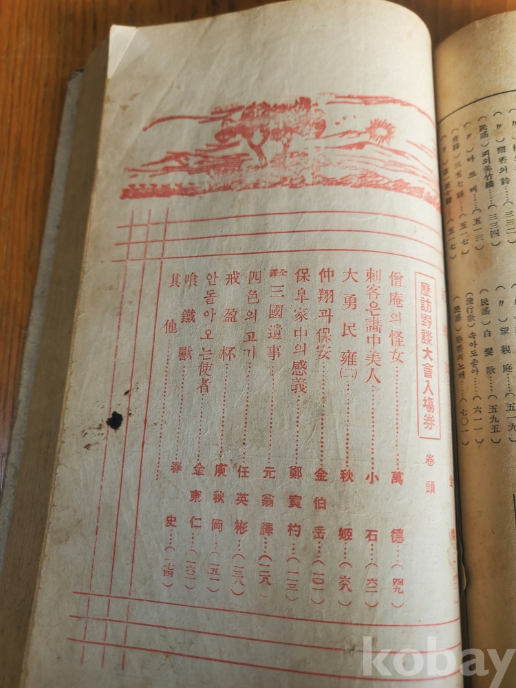 야담 6호(2권 6호) : 신명서림 광고 / 봉익이김별장(김규선 연재 만화) / 일사편편 / 서점, 사진관, 말더듬이 광고 / 조선농가연중행사력 / 속표지 / 왕기는 벋어서(김동인) / 검협랑(김환) / 김동인 작품 광고 / 거유의 삽화(김진구) / 지사 신설 안내 / 여걸(유추강) / 세계동화집 광고 / 도통한 무식(김봉흡) / 세계동화집 광고 / 삼국유사(일연선사찬, 원옹 역) / 젊은 그들(김동인 작) 광고 / 잡지 광고 / 대용민옹(추희 작, 원형 화) / 연의 인연(정인표) / 왕자의 최후(금동) / 행운의 어부(임영빈) / 야담대회 광고 / 슬프다 아랑(박상희) / 판권지 / 야담집 1권 목차 안내 //
