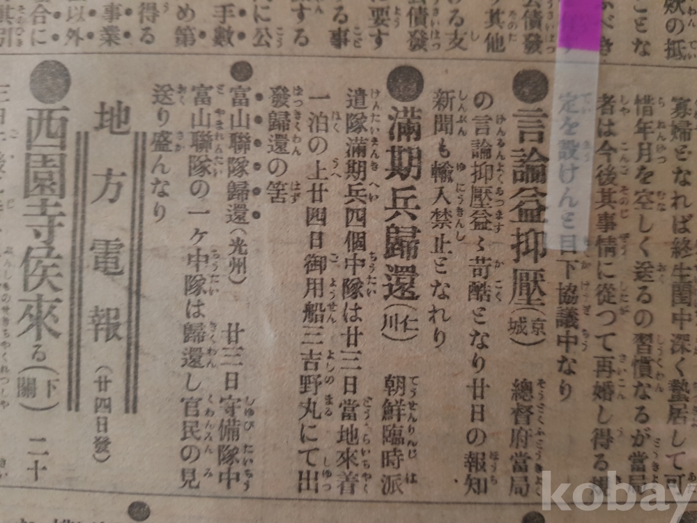 [FF15]*東京日日新聞/1911.4.25./朝鮮特電.재혼규정 협의,언론익억압(경성),만기병 귀환