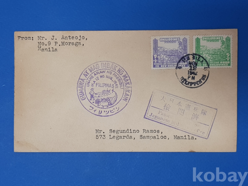 **** 필리핀 마닐라, 일본군 검열 소인분/1942.11.12/우표2매 첩부