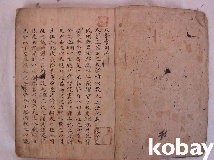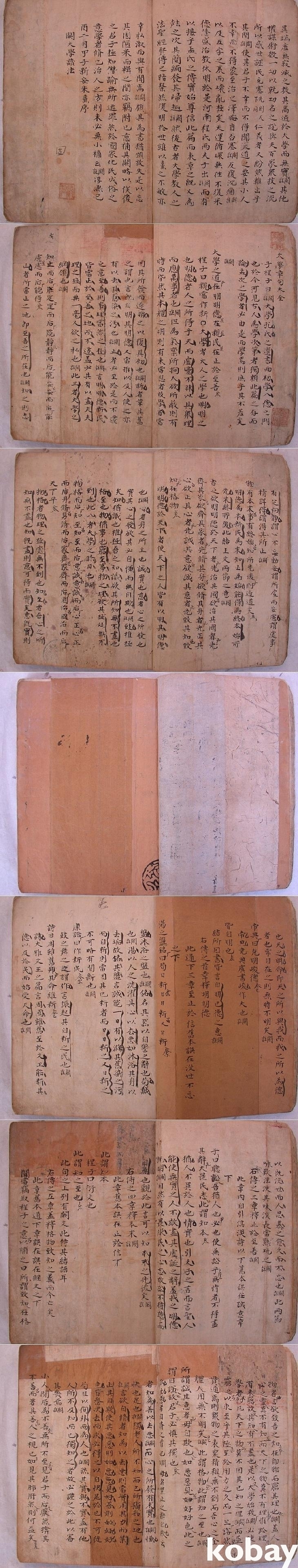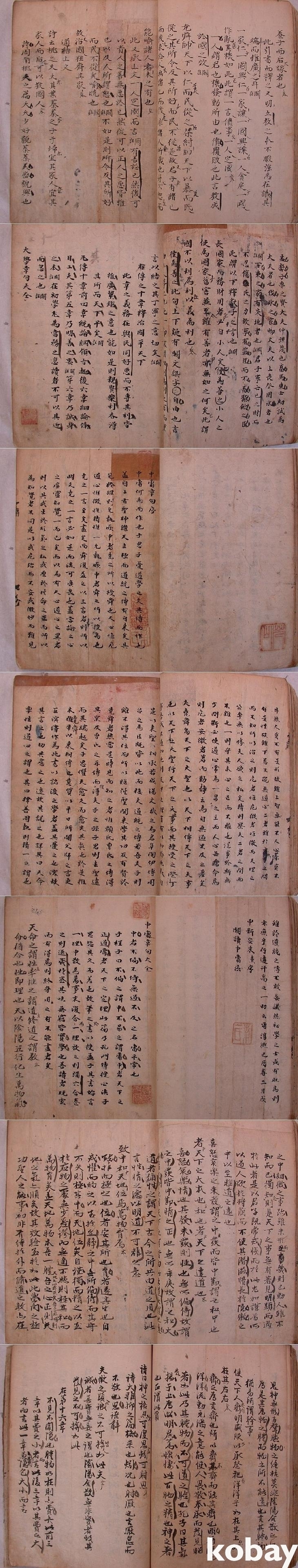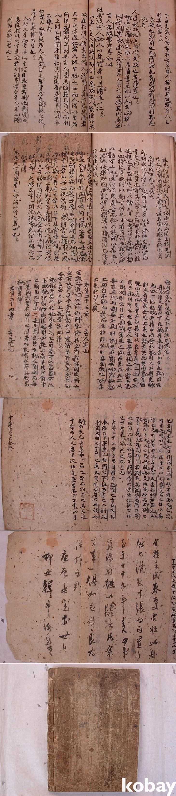 이 책의 특이한 점은 1)필사한 종이가 일반 한지가 아니라 앞쪽 대부분은 서간문의 봉투에 쓰였던 종이를 펴서 이어붙인 종이이고 간혹 편지 이면지나 싯누런 장지까지 누덕누덕 이어붙인 곳도 있다는 점이다. 그래서 봉투에 찍혔던 봉함인이 비쳐 보이는 곳이 많다. 뒤쪽은 요즘 도배 초배지처럼 질이 낮은 한지를 사용하였다. 그 다음은 2) 한 사람의 필사가 아니라 필체가 몇 번 바뀌며 해서체, 행서체로 일관되게 각자 필사하였다는 점이다. 처음 서체가 바뀌는 곳은 <대학장구> 전문 10장의 뒷부분이고 이 서체가 <중용장구>의 첫장 8행까지 이어진다. 마지막과 <중용장구>가 시작되는 앞에에도 낙관들이 찍혀 있다. 여기서부터 20장 중간까지는 가장 달필의 행초서체로 힘차게 필사되어 있다. 28장부터는 다시 다른 필체다.