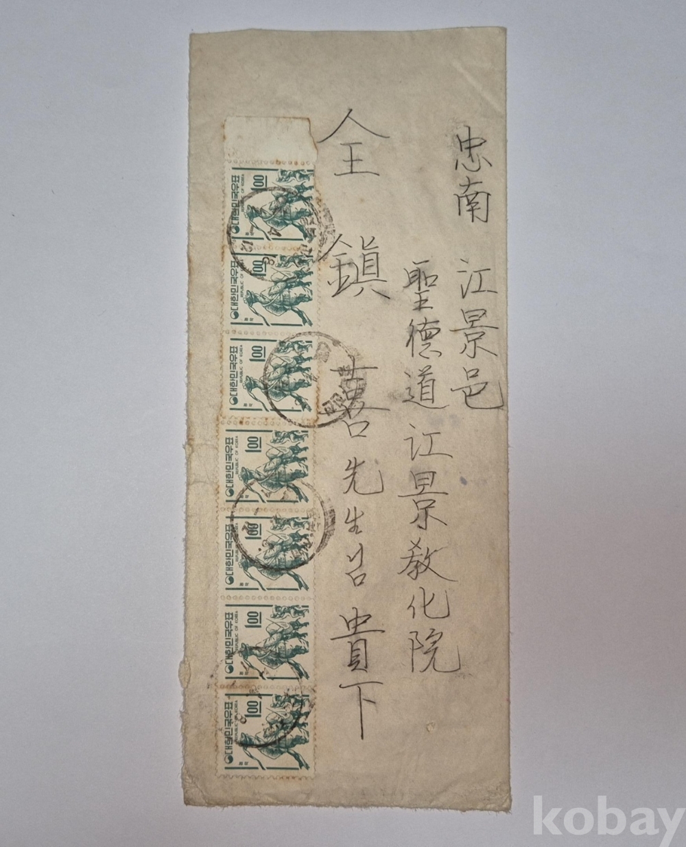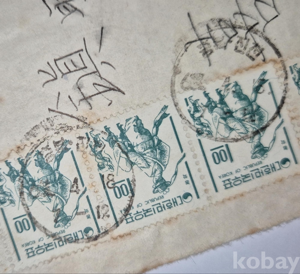 1966년 발행된 '제2차 국산백지 농악 보통우표' 7매가 복첩으로 사용된 실체입니다.