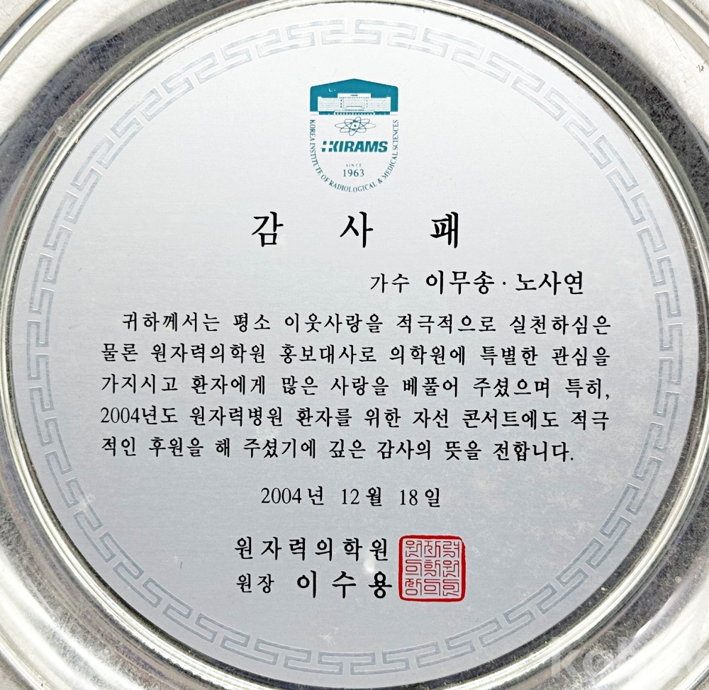 상품설명 | 원자력의학원에서 홍보대사 및 자선 콘서트 후원에 감사하는 마음을 담아 가수 이무송·노사연에서 수여한 감사패이다. | ||