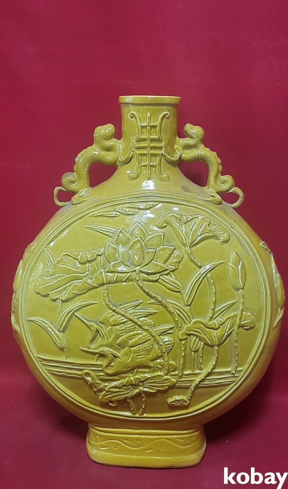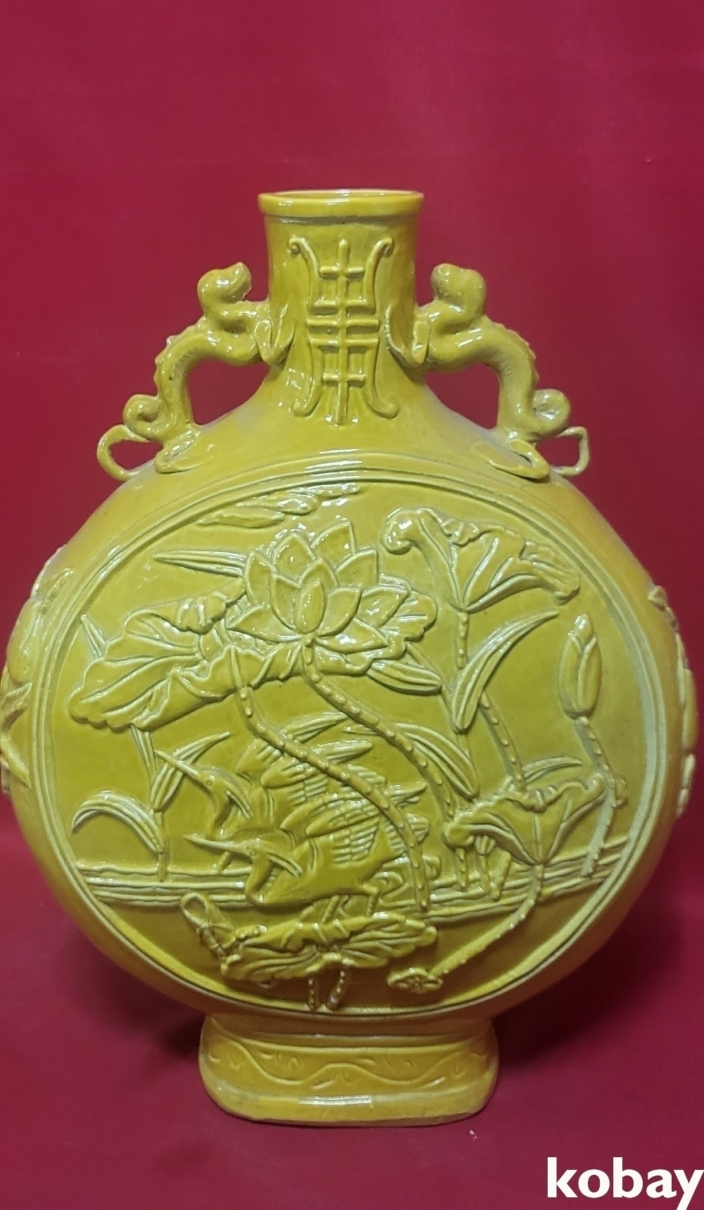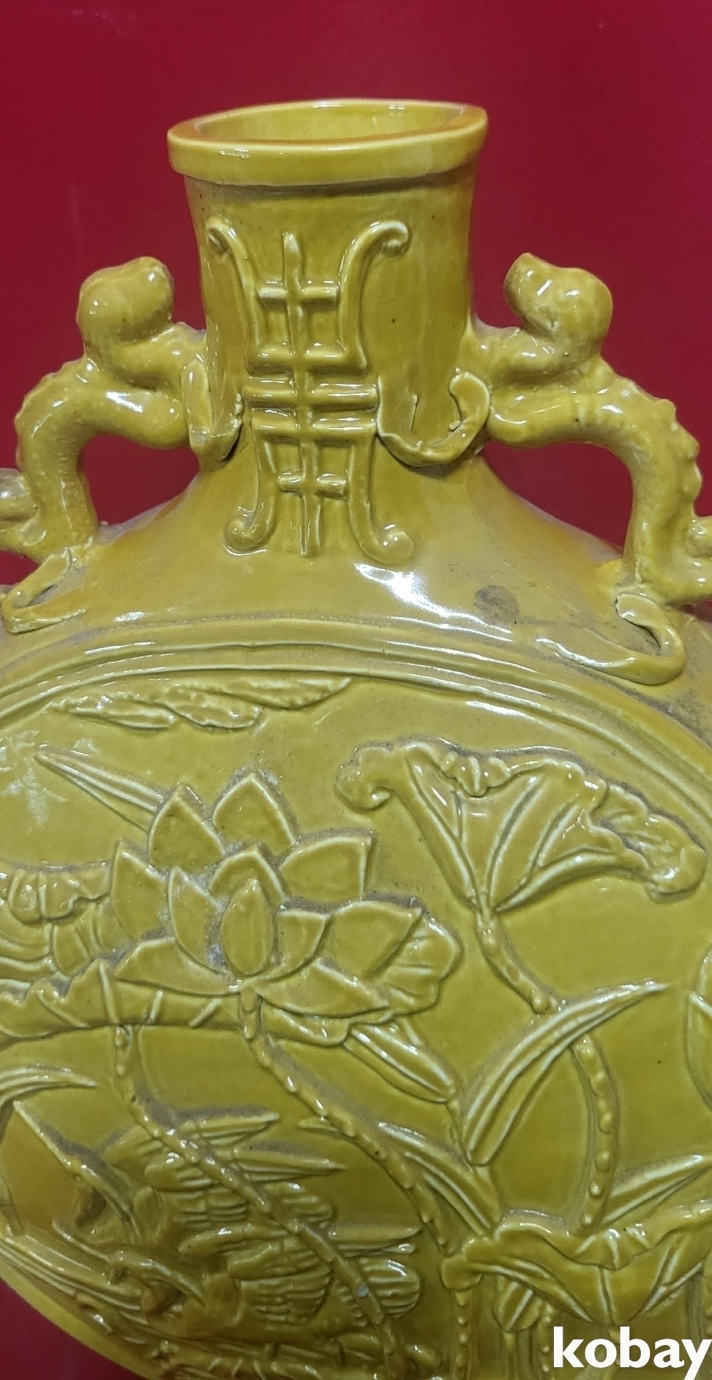 왕병영 관지 보이는 황유 연꽃과 물총새 문 양이 편병입니다,