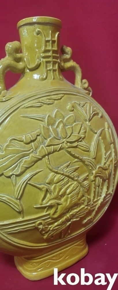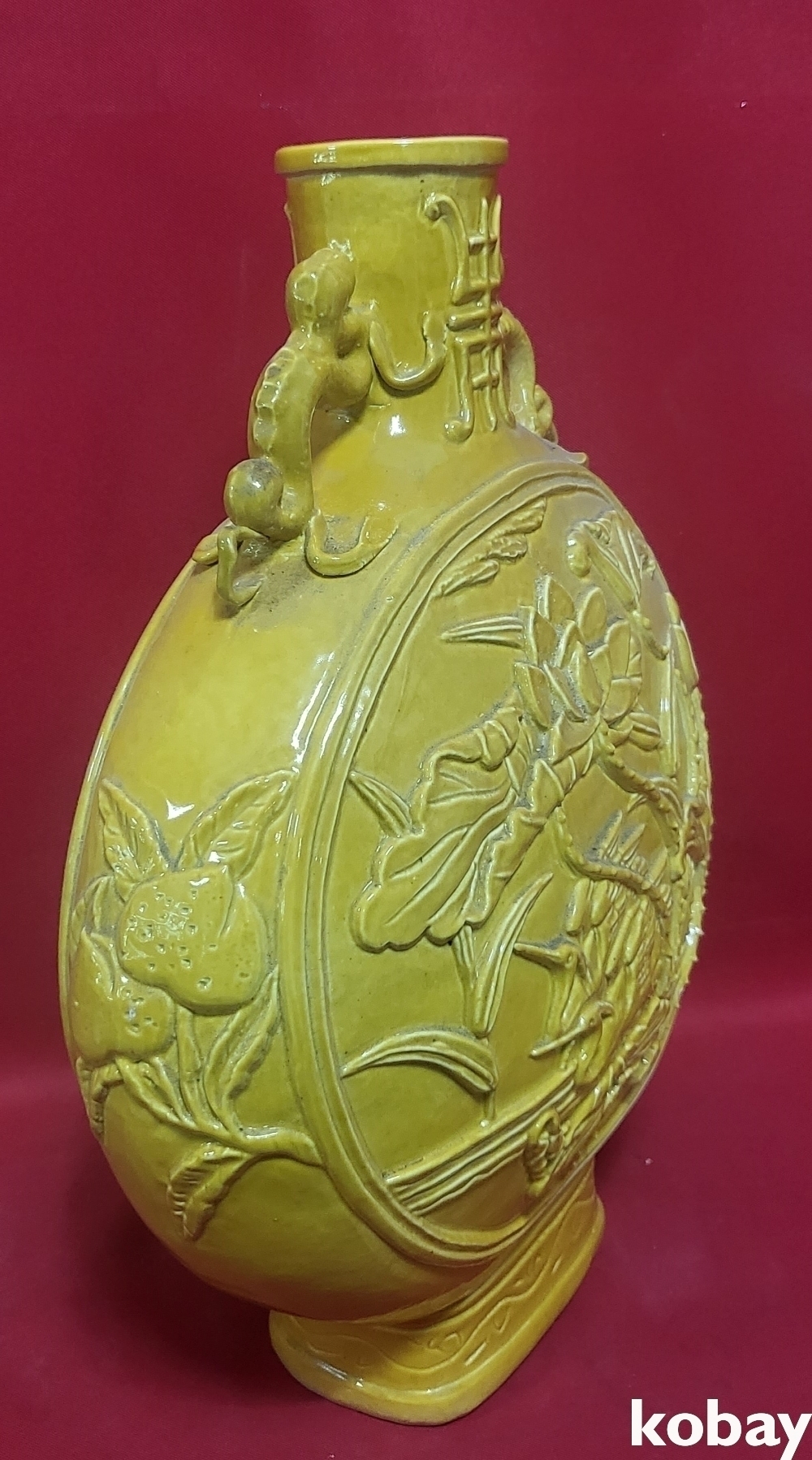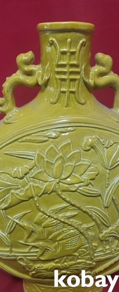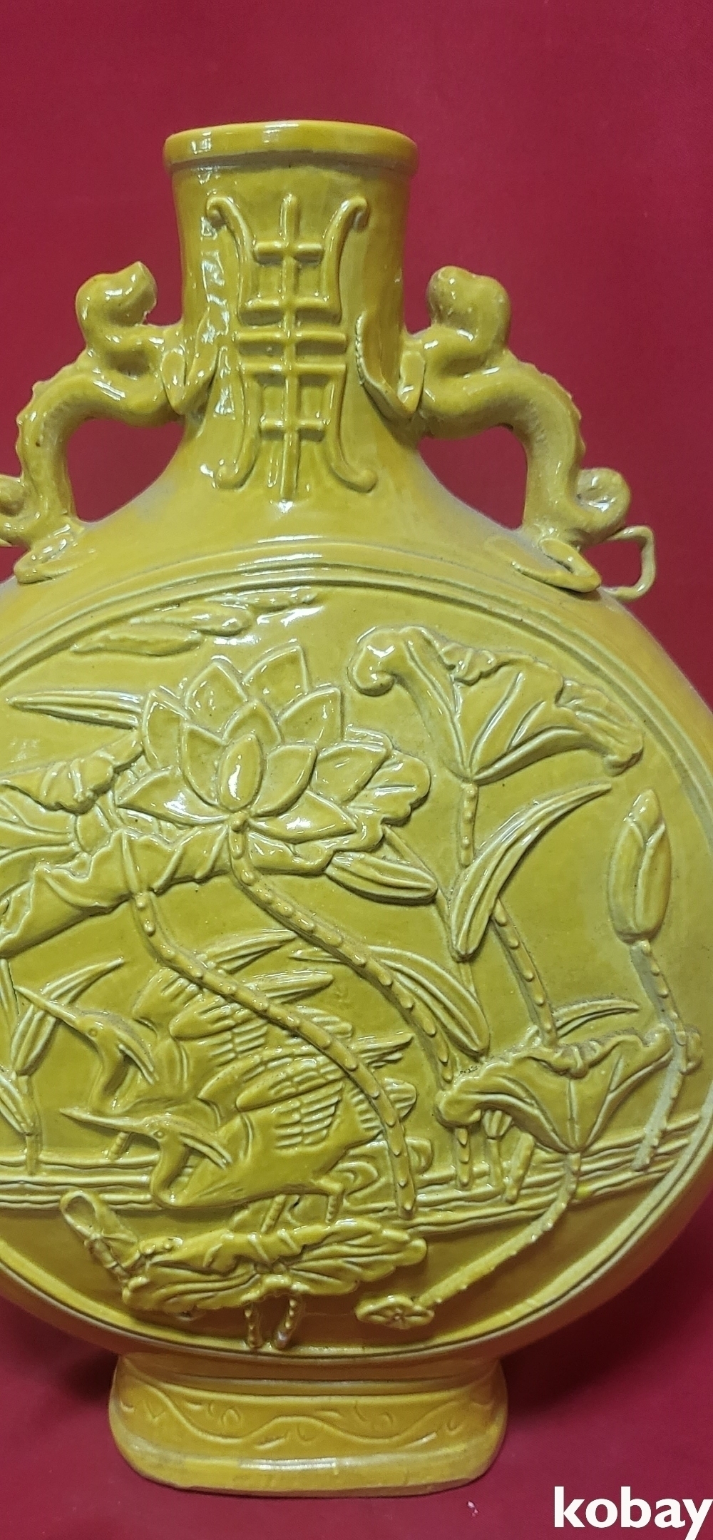 왕병영 관지 보이는 황유 연꽃과 물총새 문 양이 편병입니다,