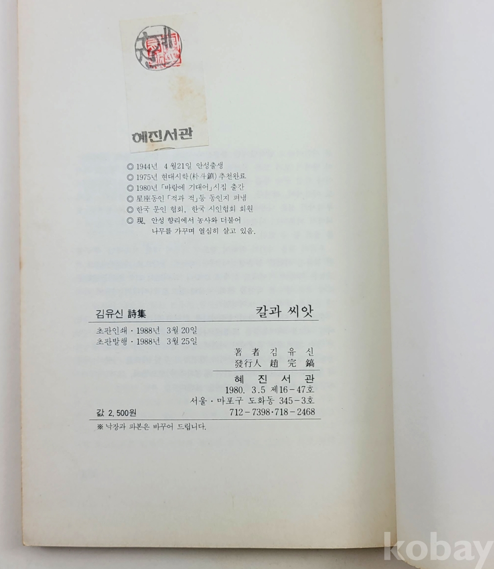 물 품 명 | 김유신 / 칼과 씨앗 / 혜진시선집(49) / 1988년 초판 / 혜진서관 |