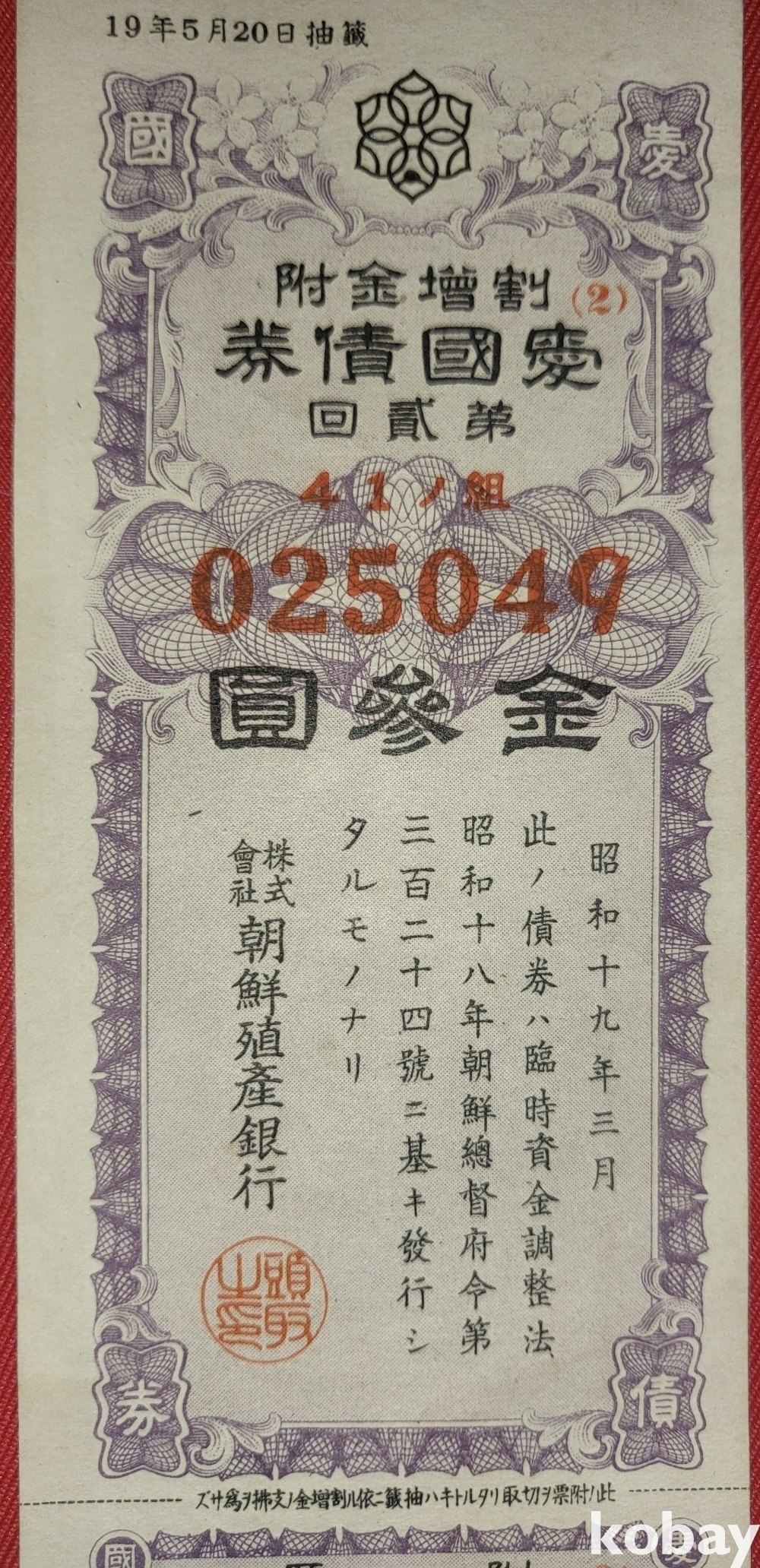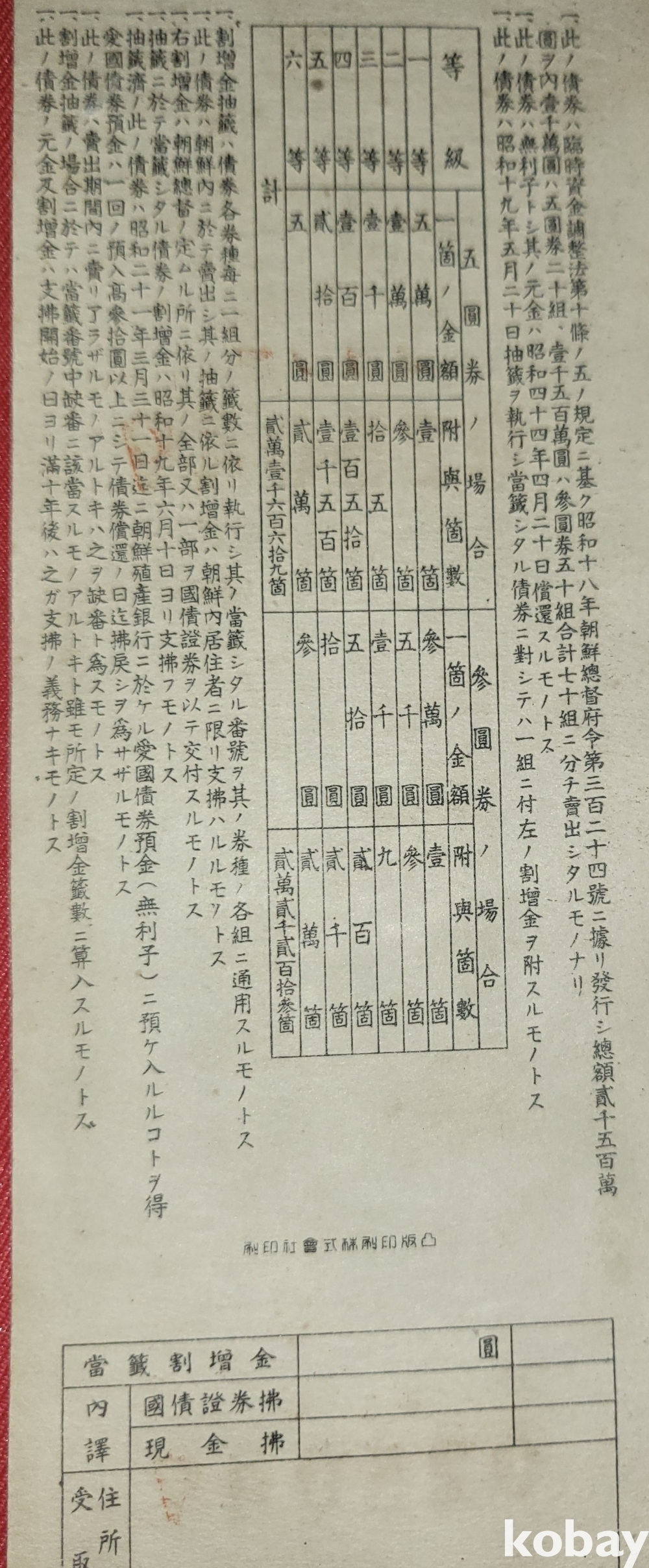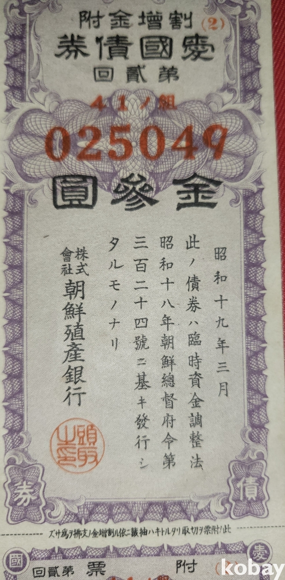 주식회사 조선 직산은행 소하19년(1943년) 발행된 할증금부(割增金附)입니다,