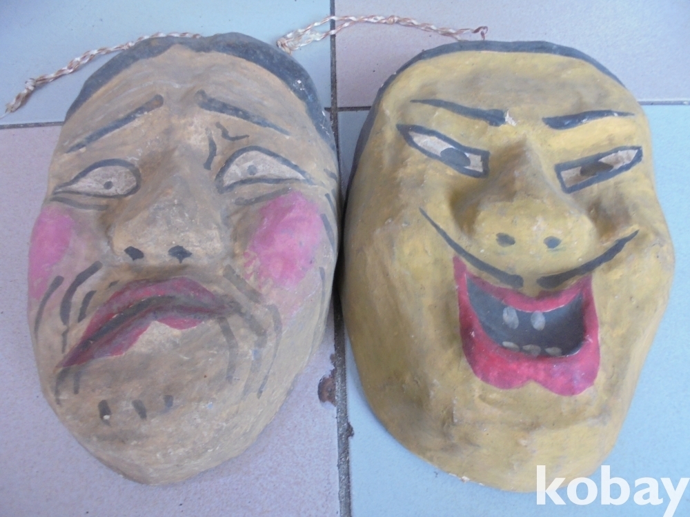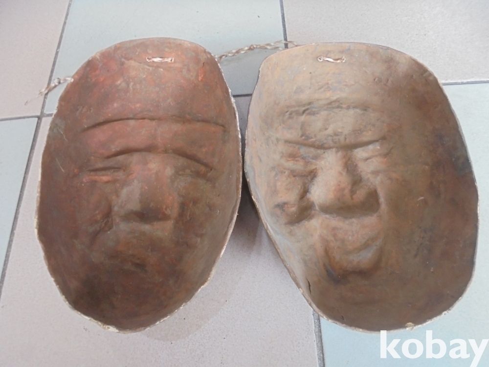 동해안에서 나온 고색의 종이 당채 남여가면 2점 가로세로뚜께 20 x 30 x 8 cm