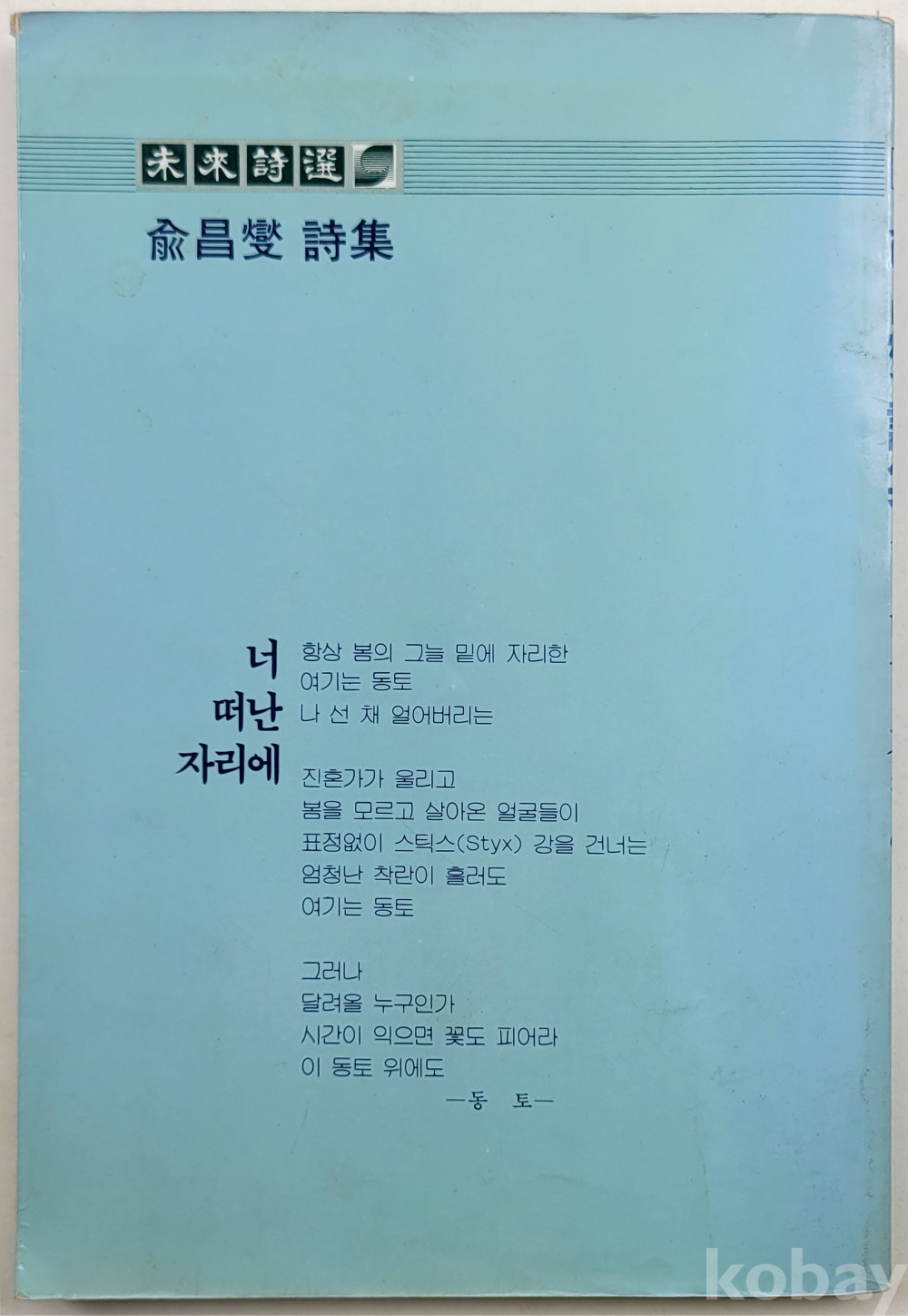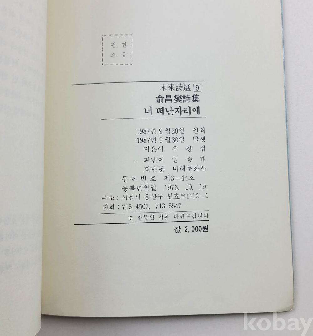 물 품 명 | 유창섭 / 너 떠난 자리에 / 미래시선(9) / 1987년 초판 / 미래문화사 |