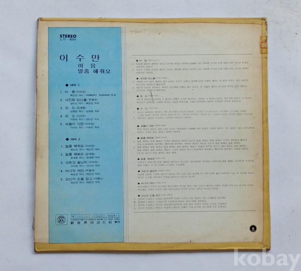 | 자켓상태 | EX : 약간의 마모, 모서리 찢김 존재 | 음반상태 | NM : 개봉했으나 미사용급, 스크래치 없음 | 발매정보 | 알수없음 | 가사지여부 | 무 |