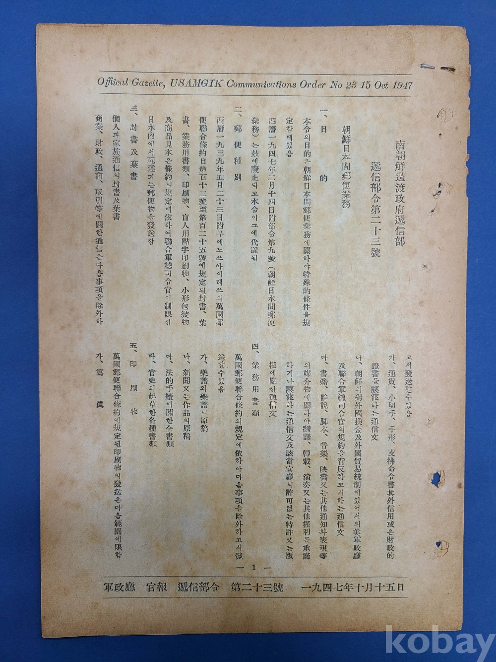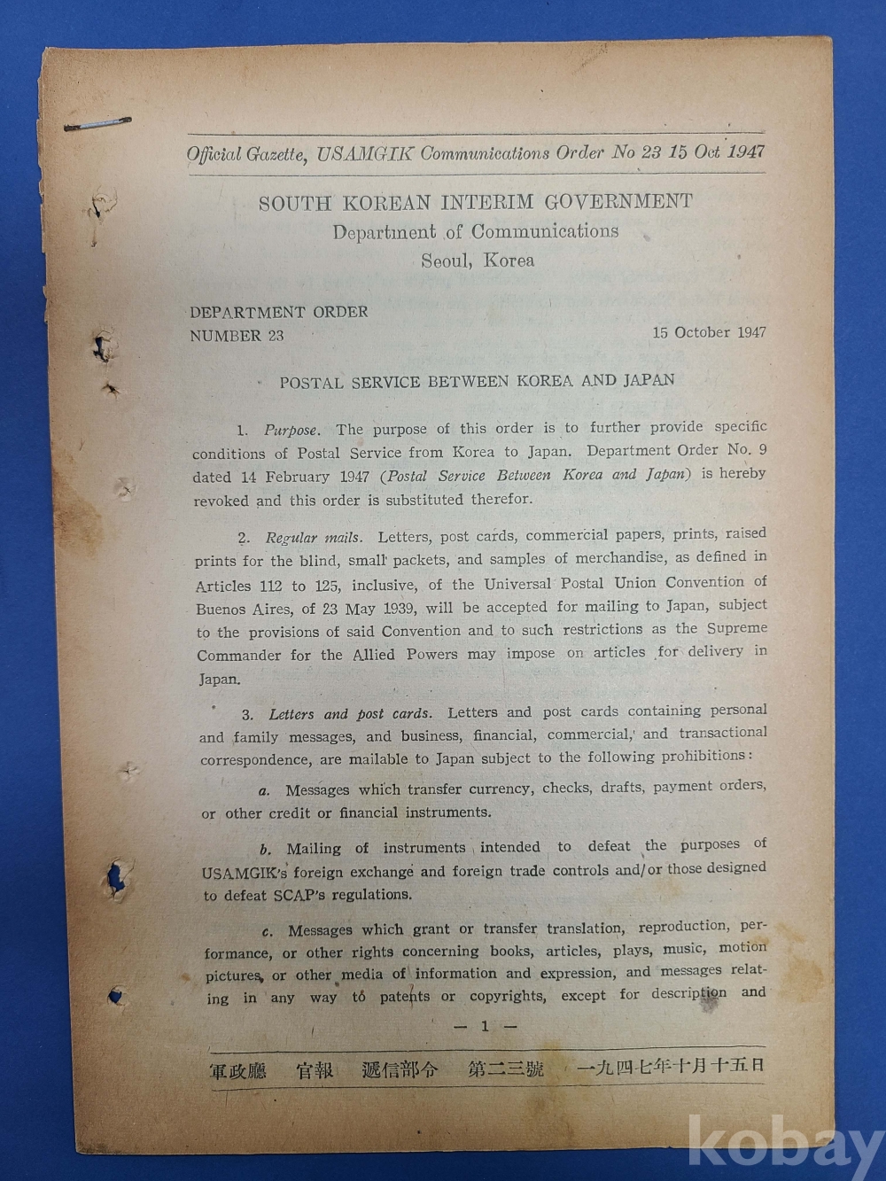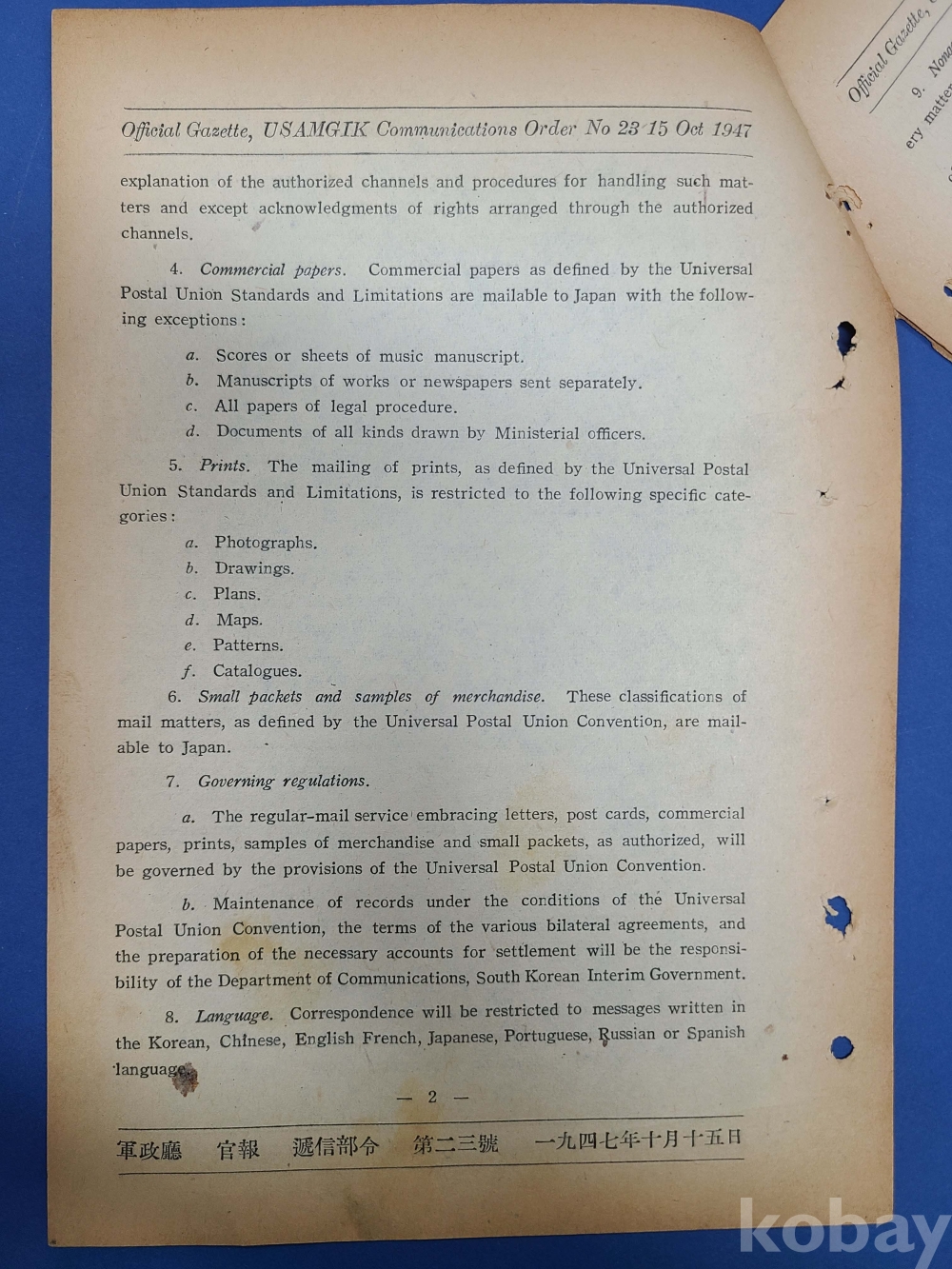 [在朝鮮美國陸軍司令部軍政廳 관보] 1947.10.15 체신부령제23호/*조선일본간우편업무