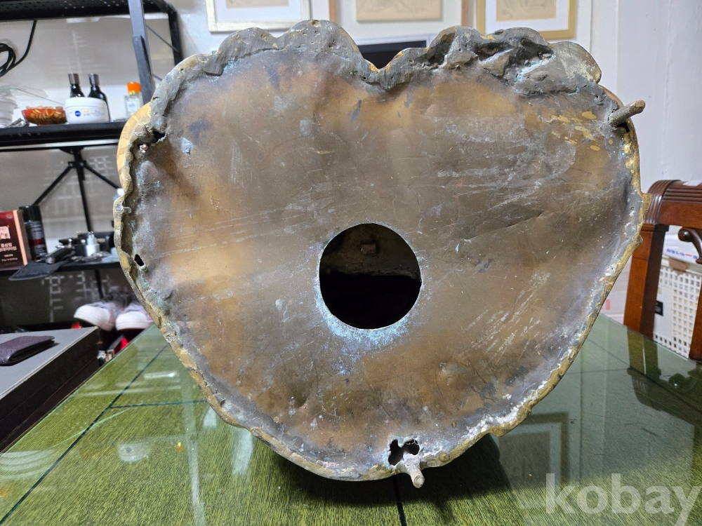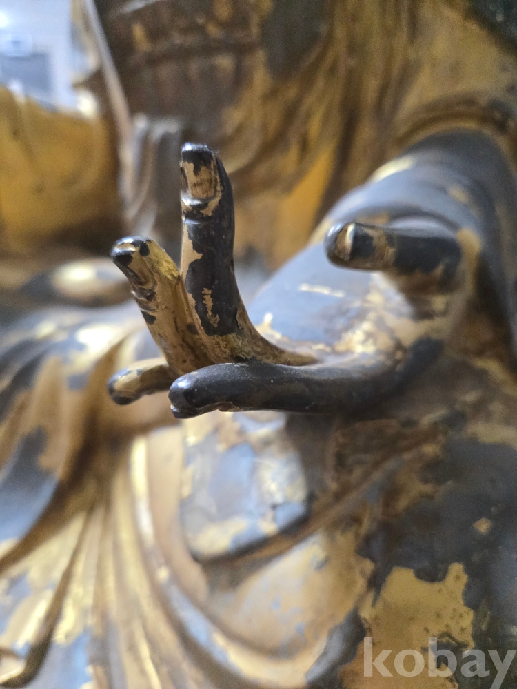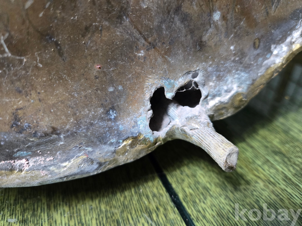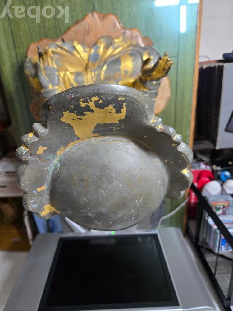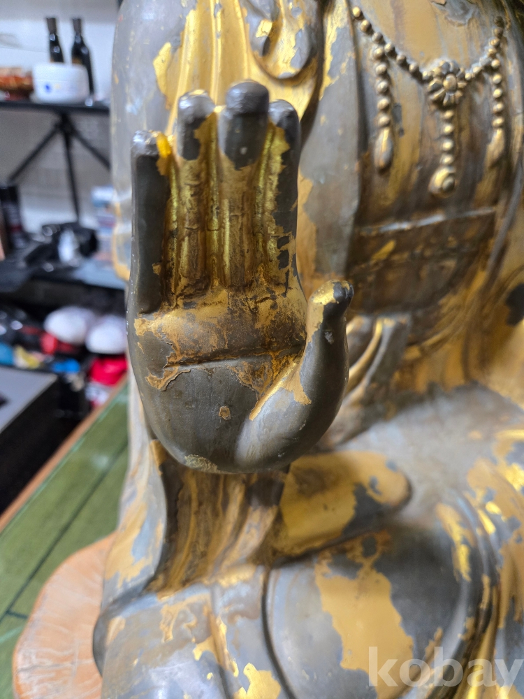 전체적으로 표면 금동이 산화되어 유실된상태인데 금동두께가 마치 종이장처럼 상당히 두꺼워 금동조각 일부를 떼어내 순금시약으로 시금할수 있는정도입니다.