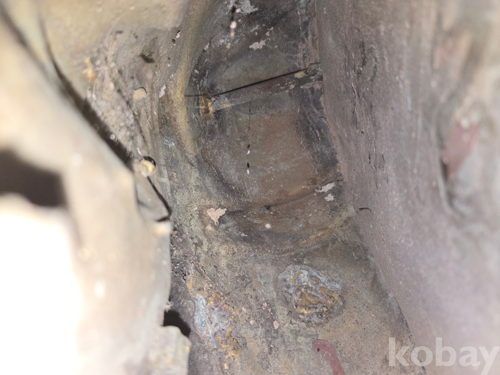 바닥 복장은 개복된상태로 예전에 좌대에 꽂아넣었을것으로 보이는 3개의 굵은 청동 핀이 불상바닥판을 뚫고 내부의 기벽에 용접되어있습니다.