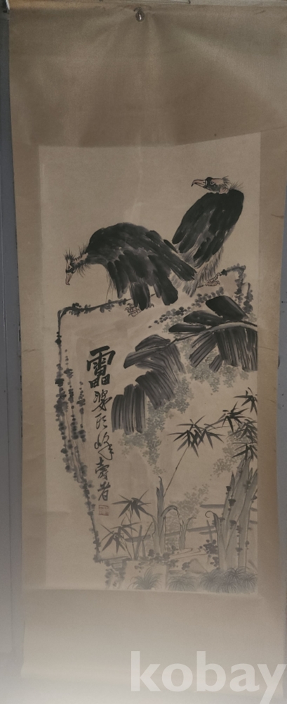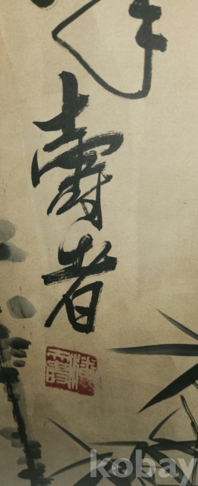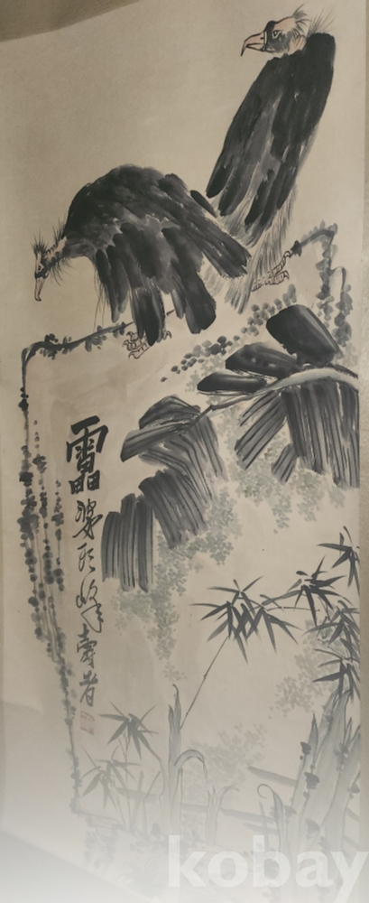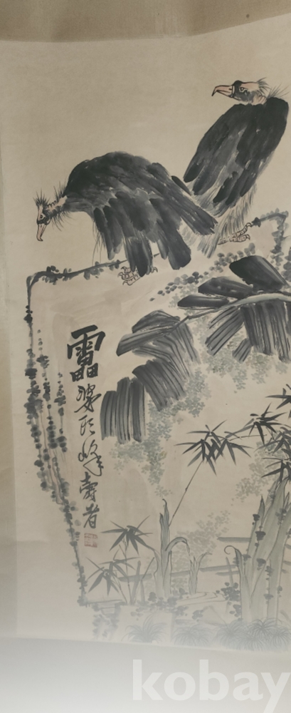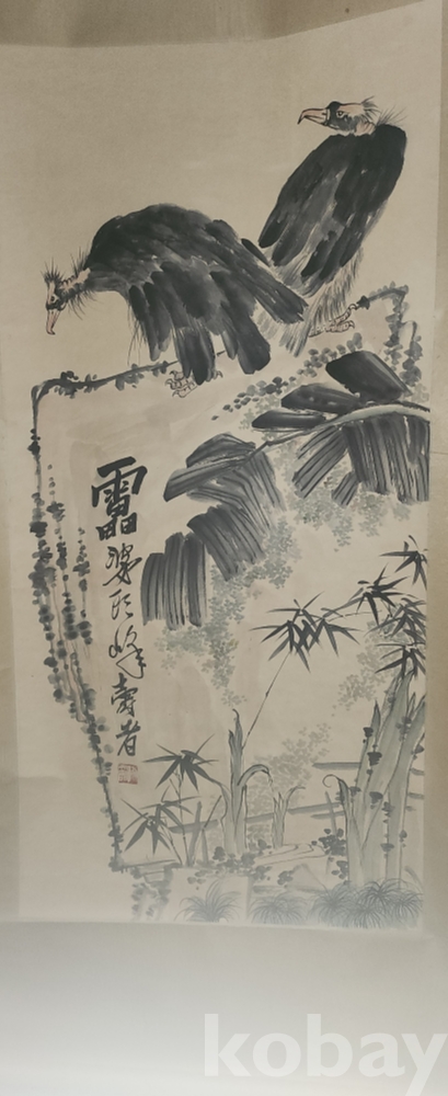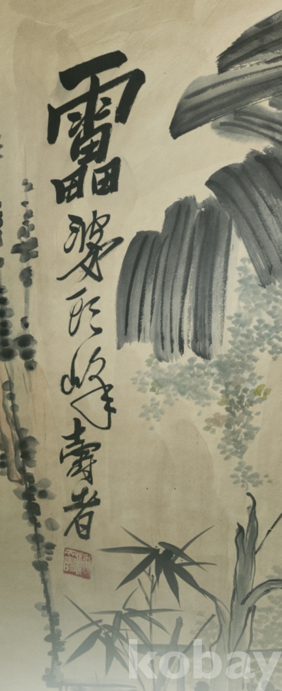 중국화가 반천수 (潘天壽) 수결이 보이는 대나무와 새 그림 큰 족자입니다,