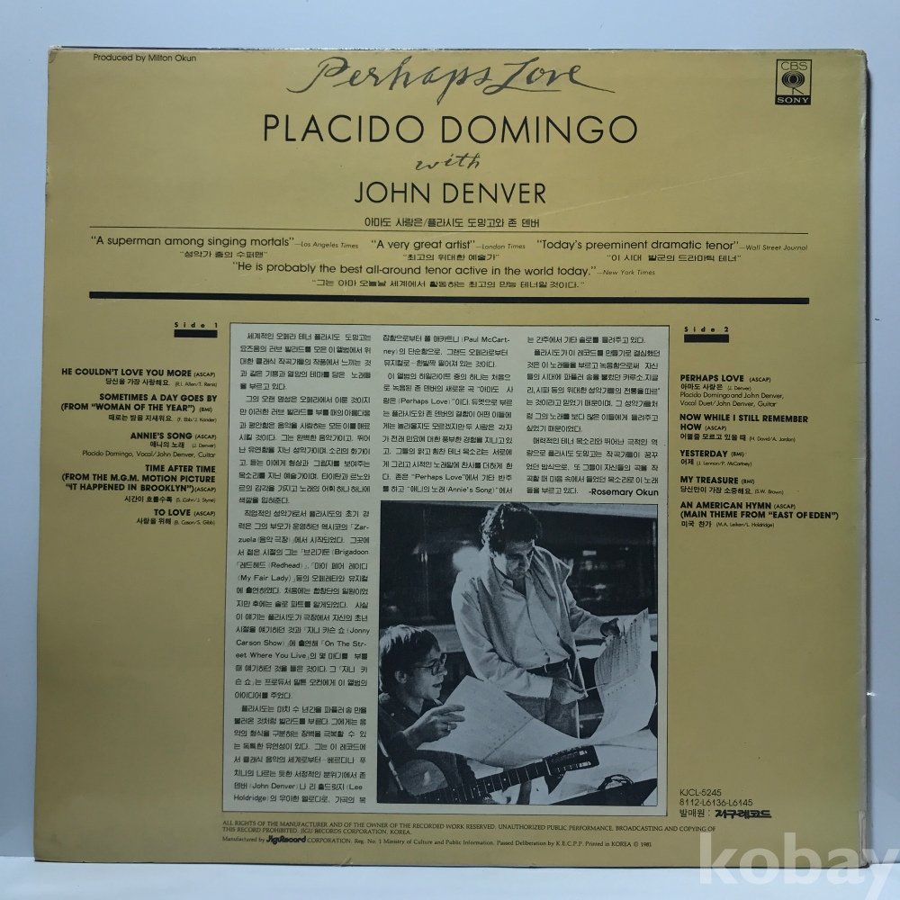 LP 30,900-233 Placido Domingo & John Denver . 82 지구 자켓 EX 알판 EX+
